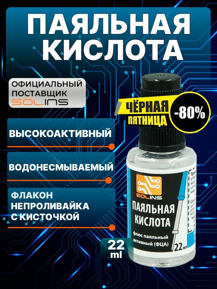 Паяльная кислота Solins ФЦА, активный флюс для пайки меди, стали, никеля, флакон с кисточкой, 22 мл