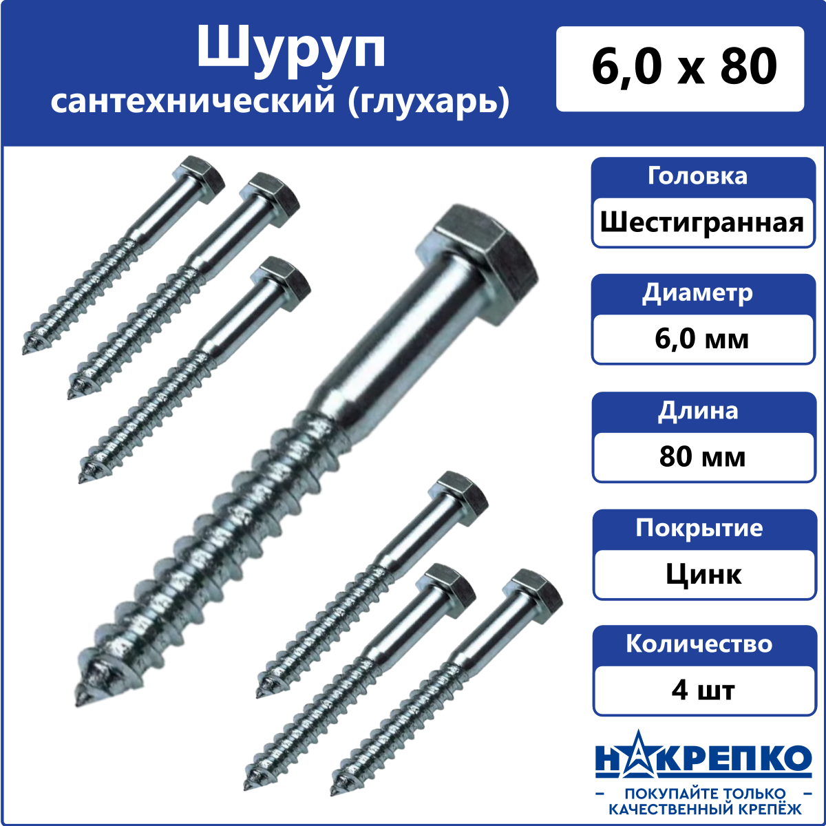 Купить Шуруп сантехнический (глухарь) 6 х 80 мм Накрепко 4 шт