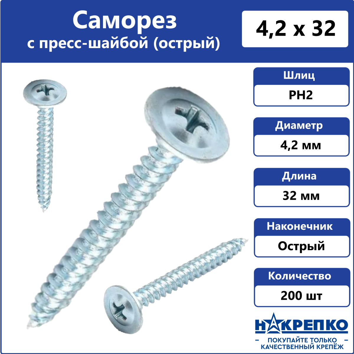 Купить Саморез с прессшайбой 4,2 х 32 мм острый 200 шт Накрепко
