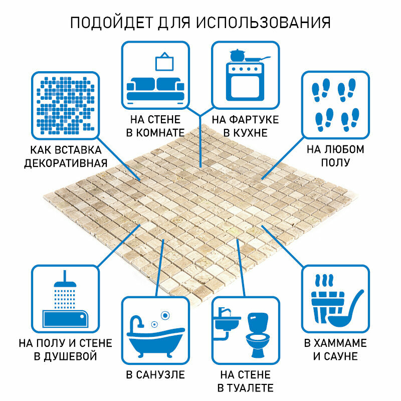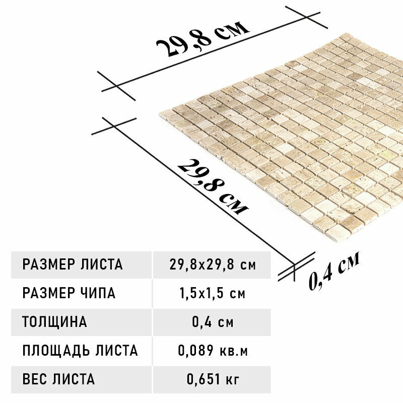 Мозаика Natural 4M090-15P-Travertine из глянцевого травертина размер 29.8х29.8 см чип 15x15 мм толщ. 4 мм площадь 0.089 м2 на сетке интересное: