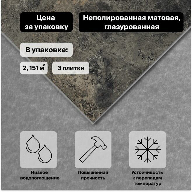 | Дополнительная информация | тон (оттенок) плитки может отличаться от партии к партии; каждая новая партия плитки имеет оттенок, отличающийся от оттенка предыдущей партии в силу особенностей производственного процесса плитки; отличие тона плитки разных партий не является производственным браком продукции |