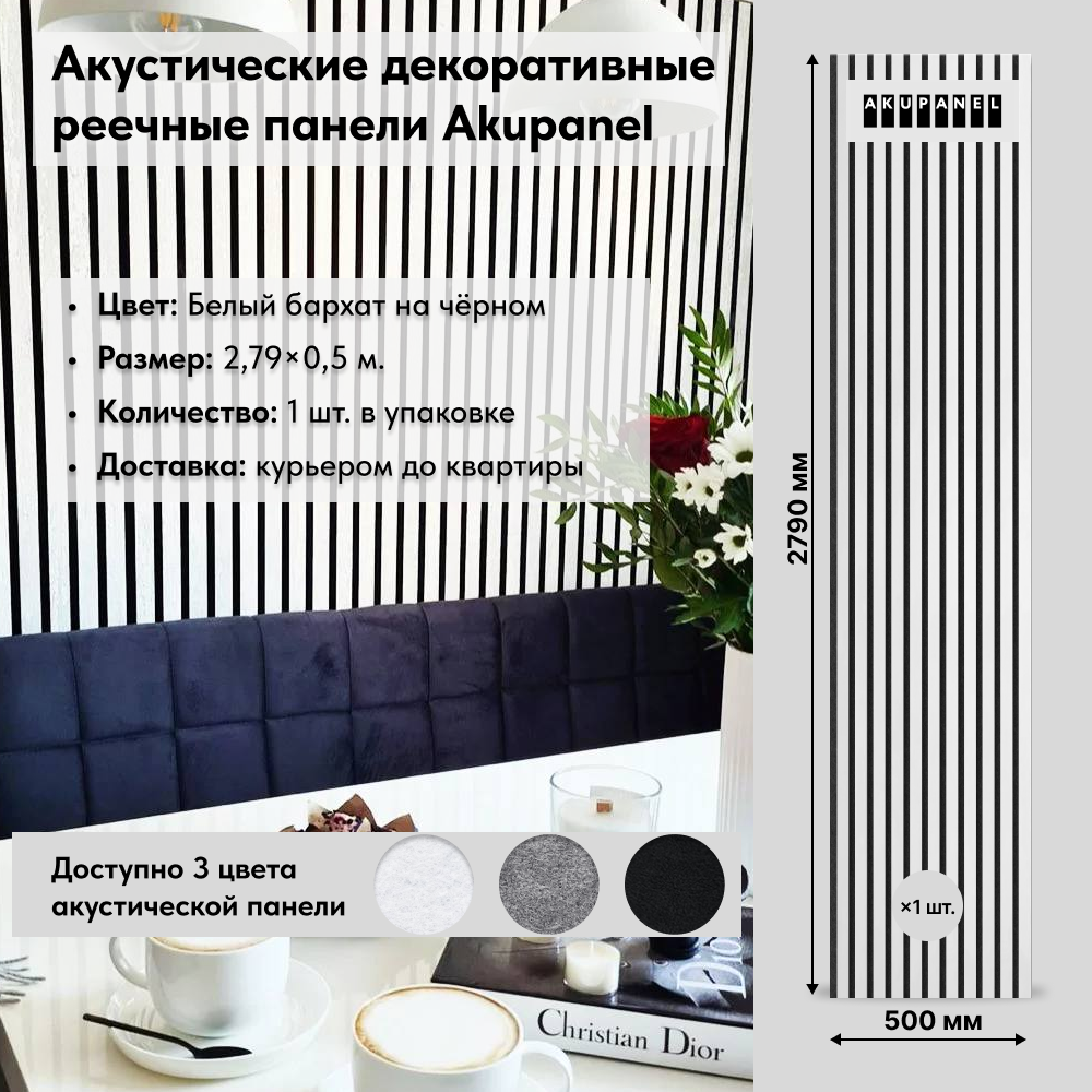 Купить Акустическая реечная панель AKUPANEL - Декоративные рейки (Белый бархат) и чёрная акустическая панель Акупанель