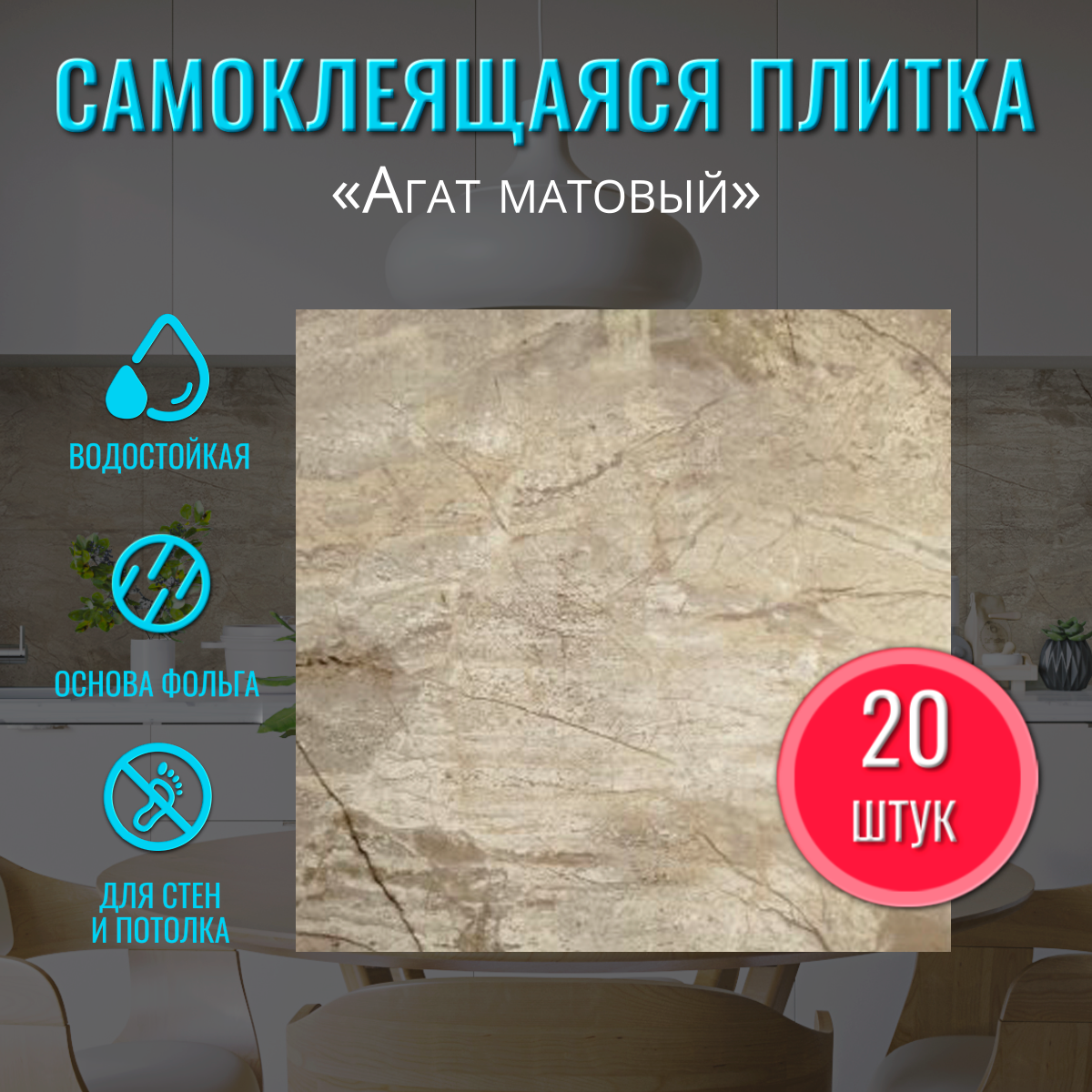 Купить Влагостойкая самоклеющаяся панель матовая на стену для кухни и для ванной "Агат матовый" 30х30 см 20 шт. самоклеющаяся плитка на стену декор вместо кухонного фартука