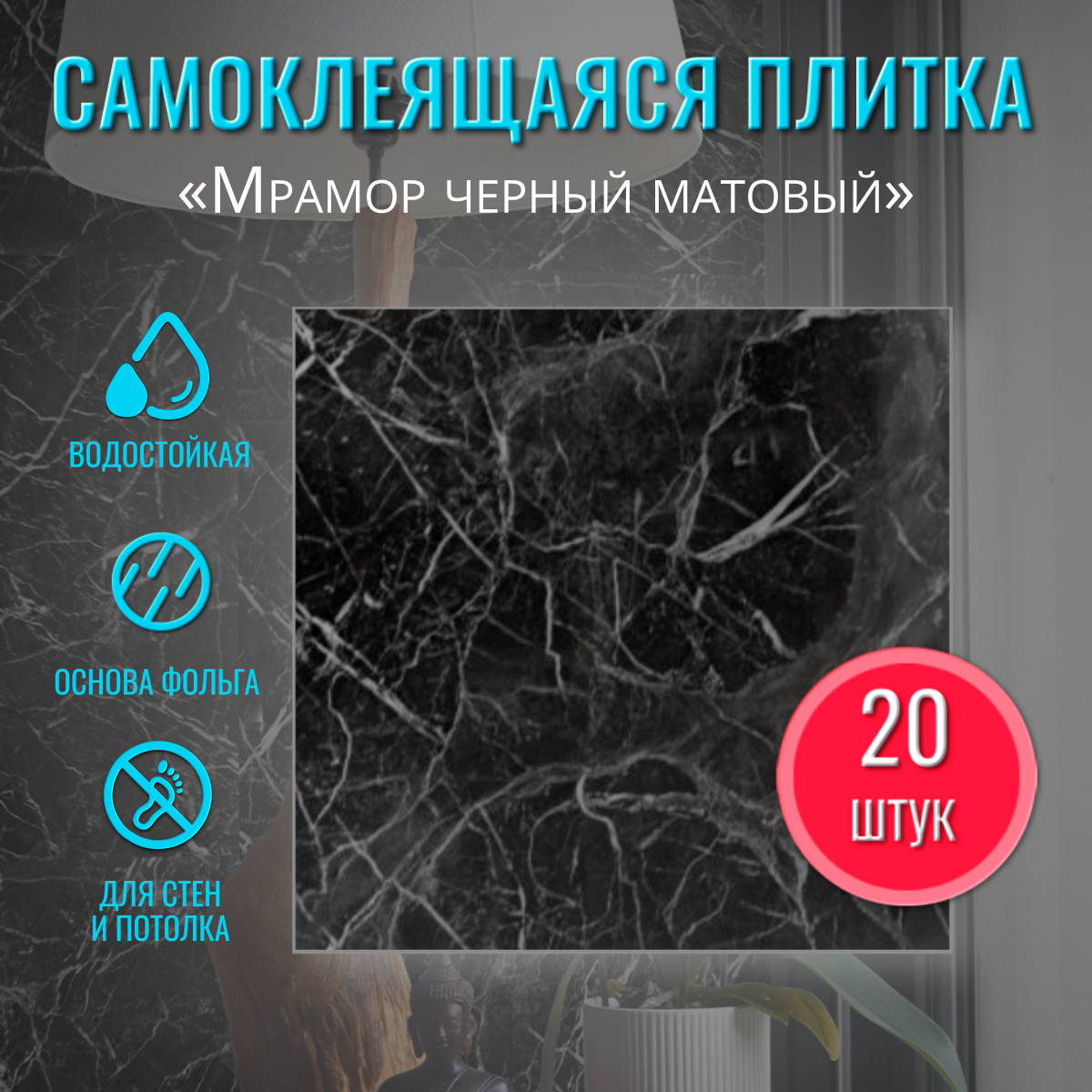 Купить Влагостойкие стеновые панели самоклеящиеся для стен и пола "Мрамор черный матовый" 30х30 см 20 шт. ссамоклеющаяся плитка декор вместо кухонного фартука
