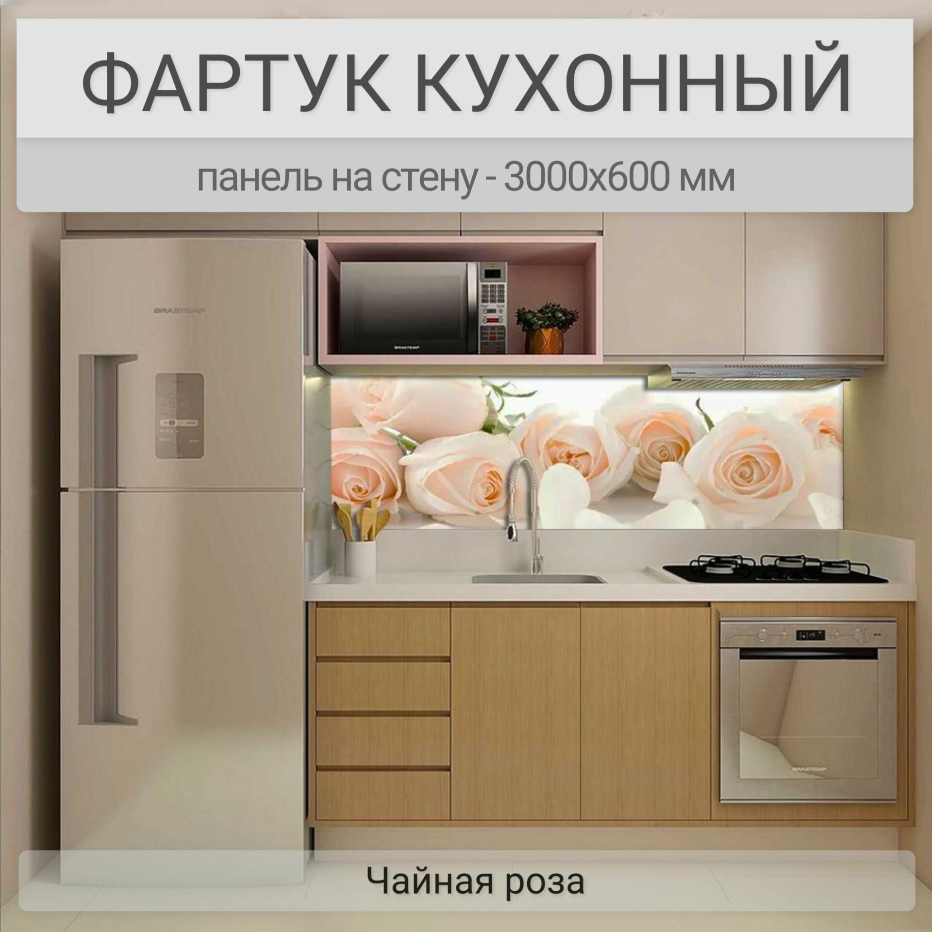 Фартук для кухни на стену 3000х600 мм, глянцевый Чайная роза. Панель стеновая ПВХ влагостойкая декоративная