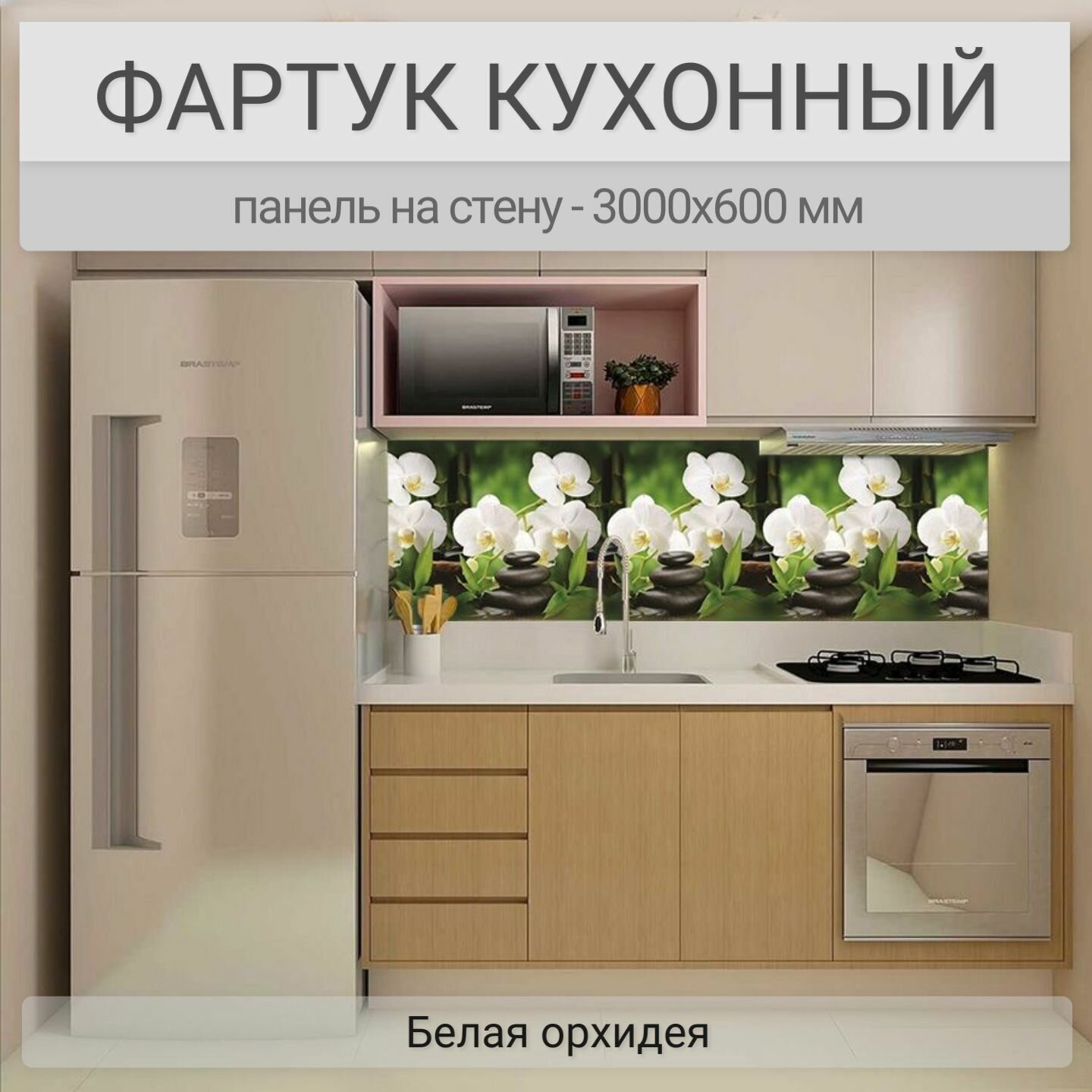 Фартук для кухни на стену 3000х600 мм, полуглянцевый Белая орхидея. Панель стеновая ПВХ влагостойкая декоративная