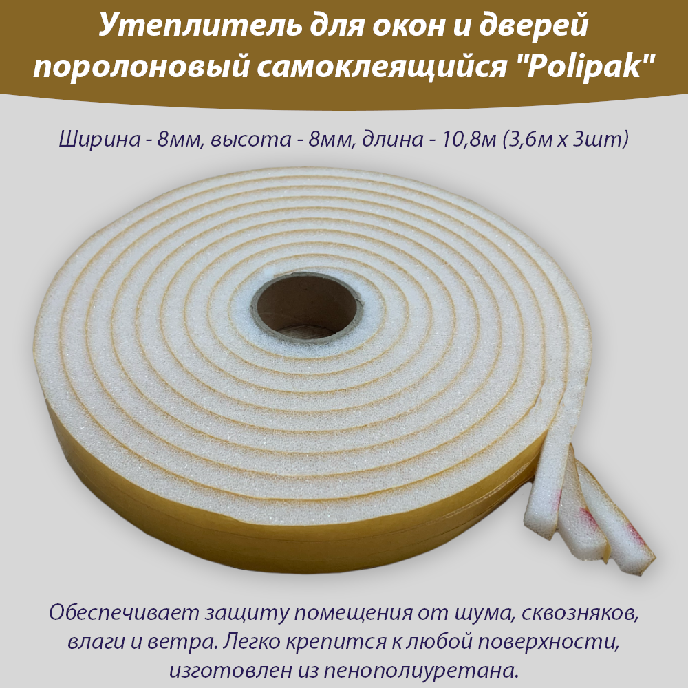Утеплитель для окон и дверей поролон 10,8 м * 8мм* 8мм, уплотнитель самоклеящийся Polipak интересное: