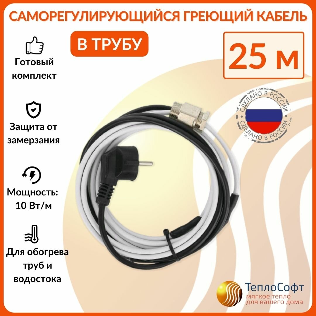 Греющий кабель в трубу саморегулирующийся 13м 130Вт / для водопровода / для водостока / обогрев труб