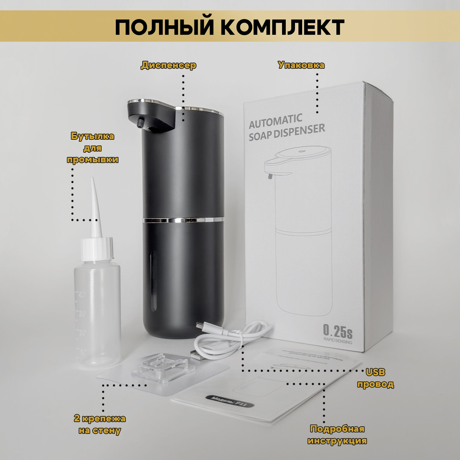 | Подробная комплектация | Кабель USB TYPE-C; Инструкция на русском языке; Флакон для промывки; Крючок настенный, для фиксации дозатора - 2 шт; Упаковка в виде красивой коробки |