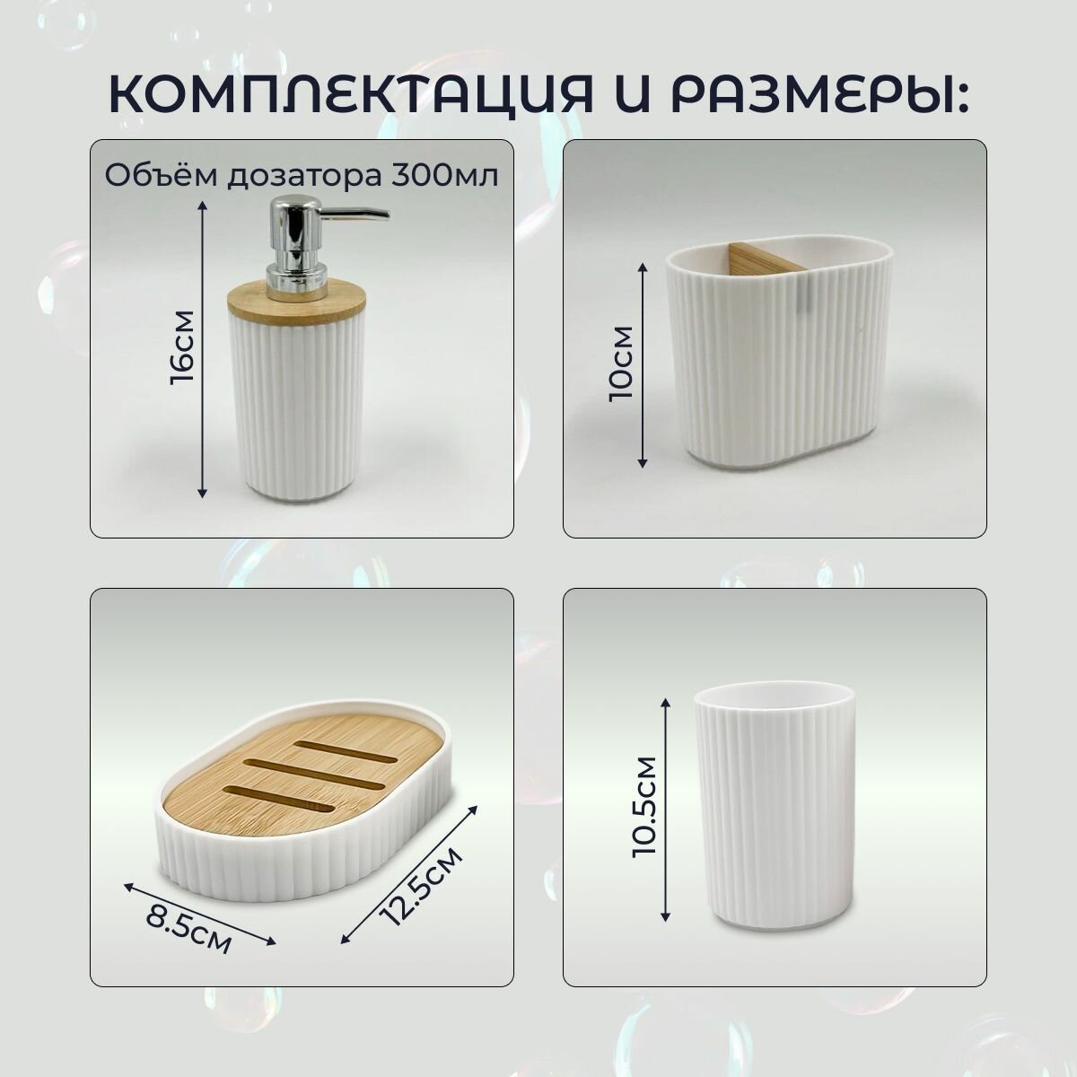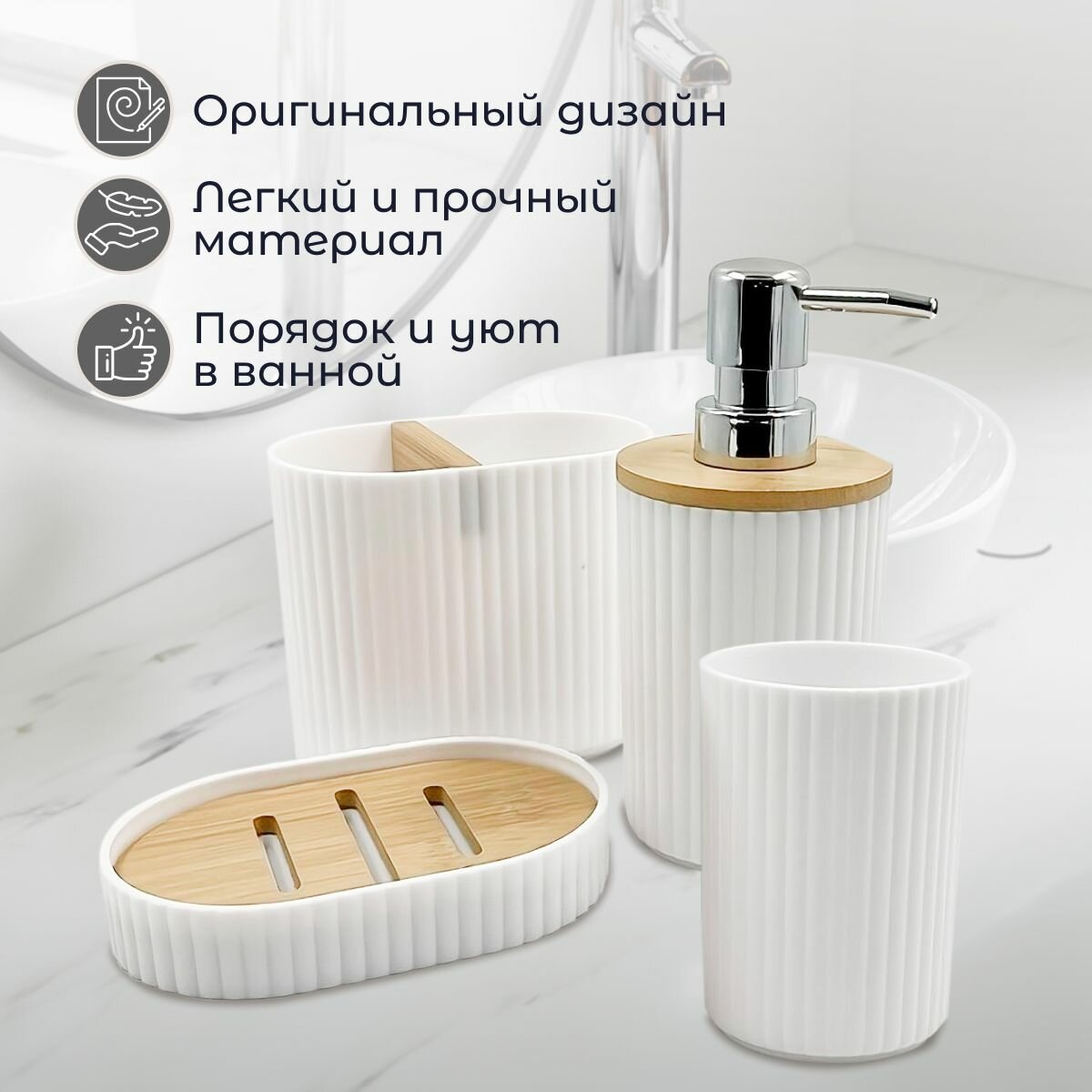 | Состав набора | дозатор, мыльница, стакан для зубных щеток |