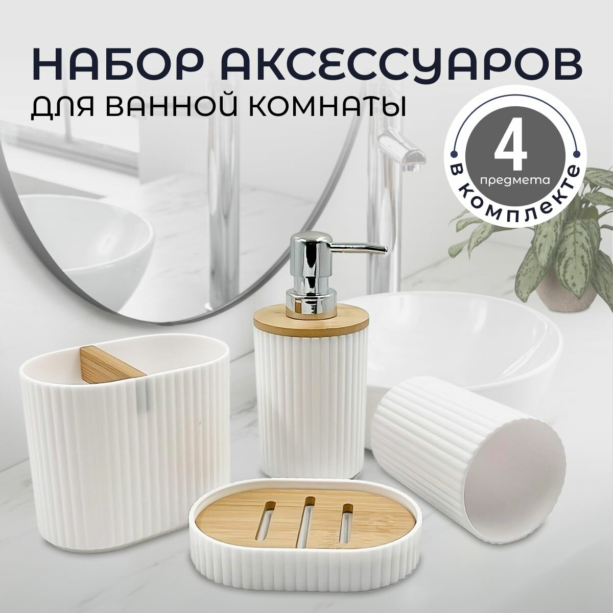 Набор аксессуаров для ванной комнаты: диспенсер для мыла, стакан для зубных щеток, стакан, мыльница; белый интересное: