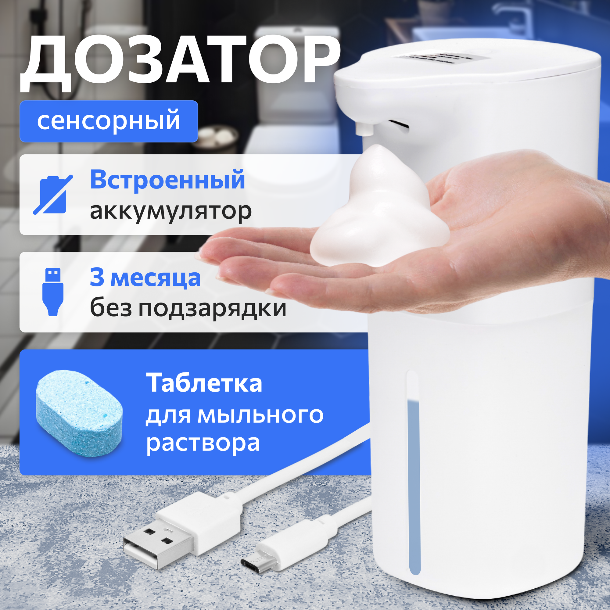 | Подробная комплектация | Диспенсер 1 шт; USB провод для зарядки; таблетка для мыльного раствора |