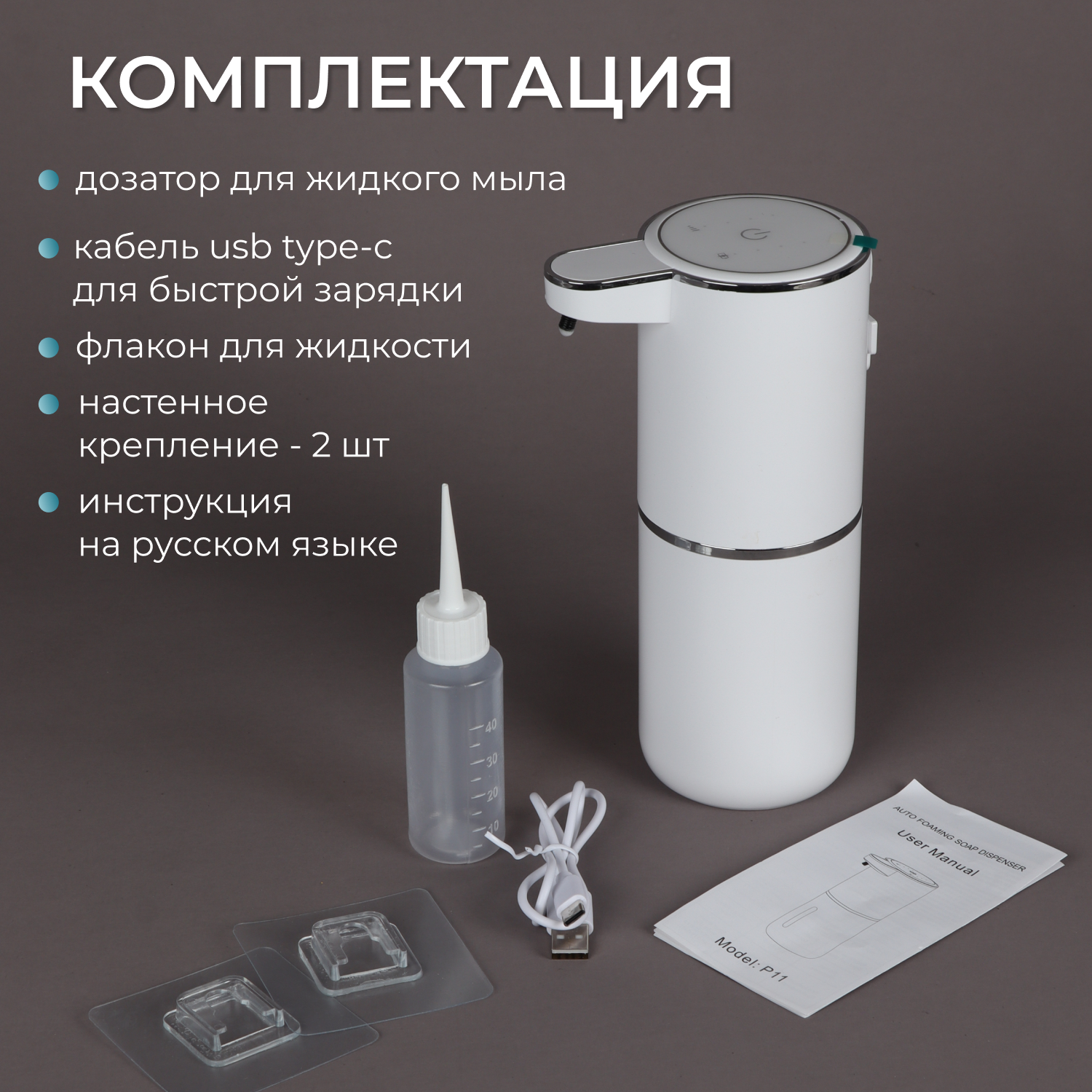 | Подробная комплектация | 1) Автоматический дозатор для жидкого мыла - 1 шт. 2) Кабель usb type-c для быстрой зарядки - 1 шт. 3) Флакон для жидкости - 1 шт. |