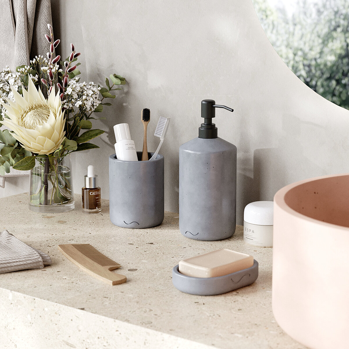 Набор для ванной комнаты Astrid 30 (дозатор с черной помпой, стакан, мыльница), бетон, серый матовый