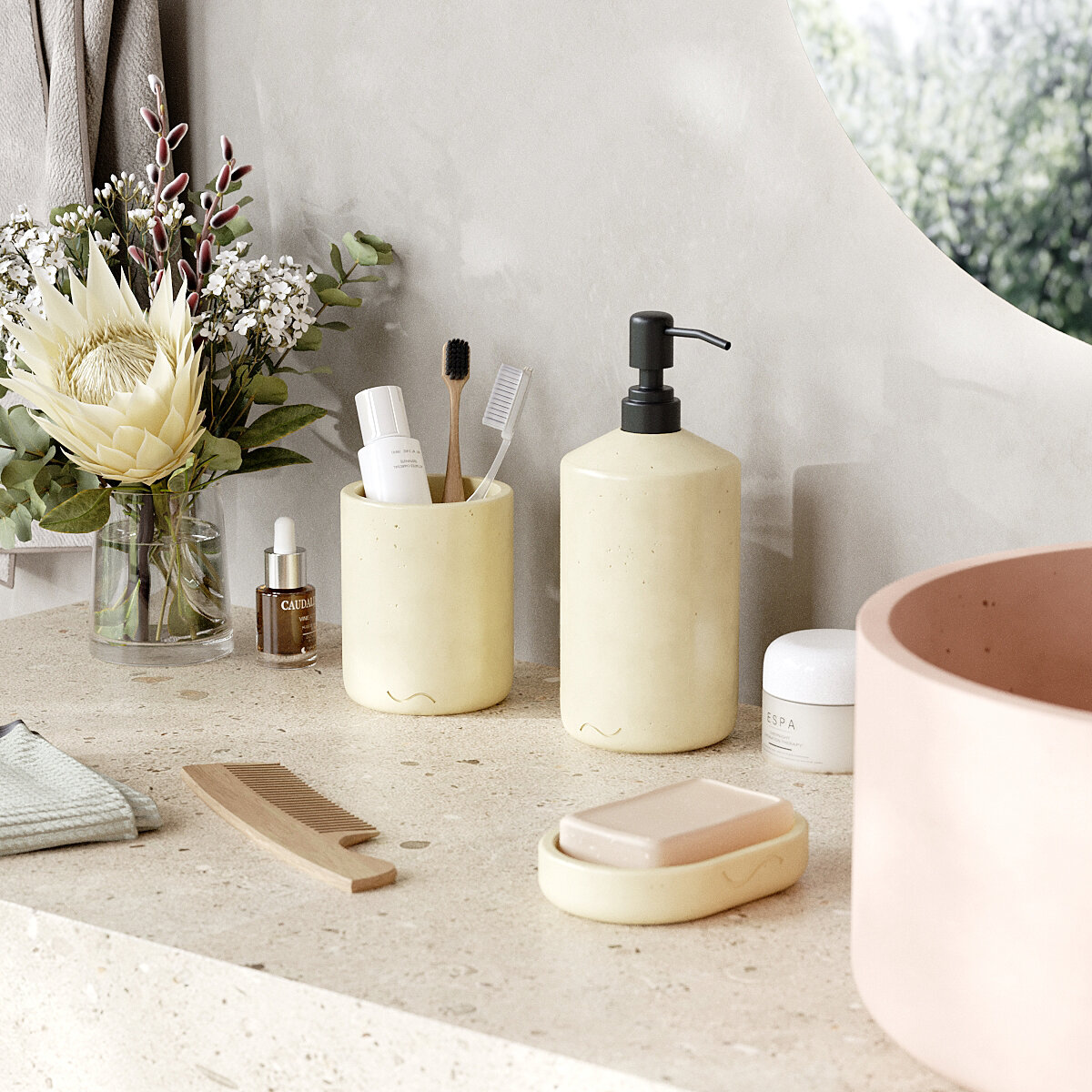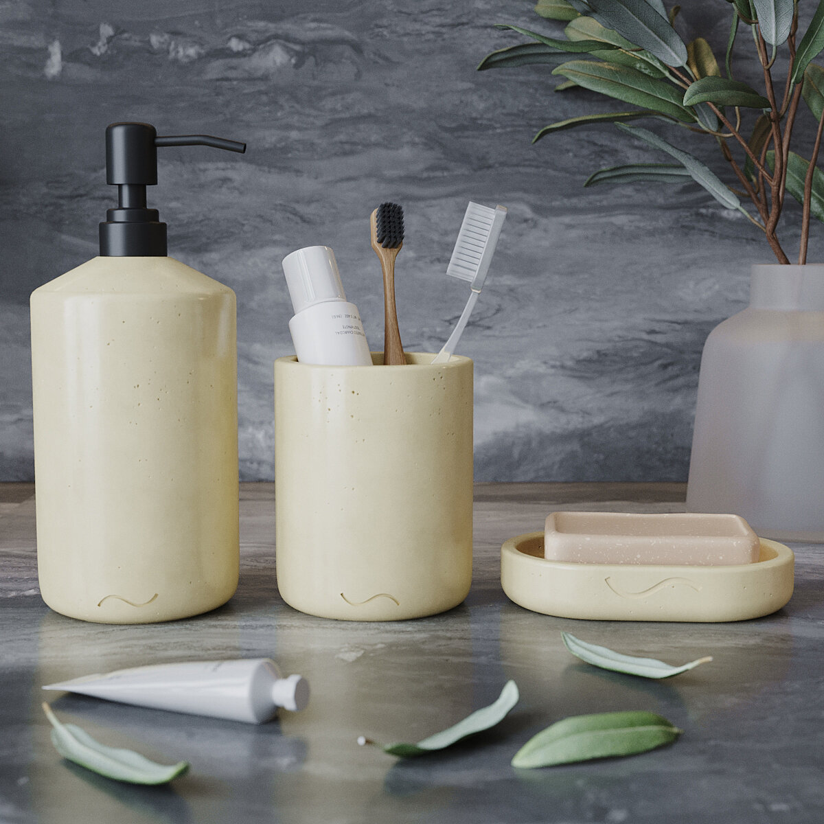 Набор для ванной комнаты Astrid 30 (дозатор с черной помпой, стакан, мыльница), бетон, кремовый матовый