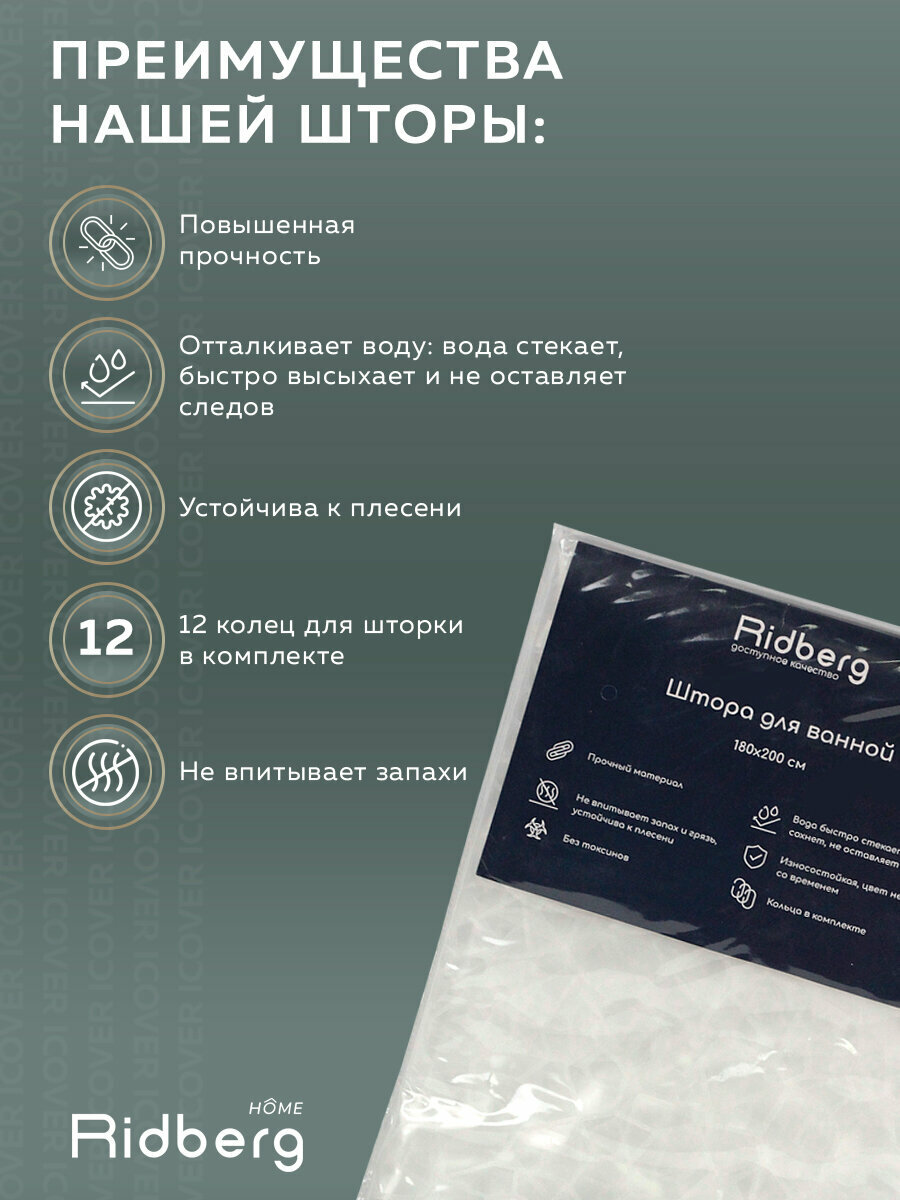 Штора для ванной Ridberg Ракушка PEVA 180х200 см, с кольцами / шторка для душа водоотталкивающая интересное: