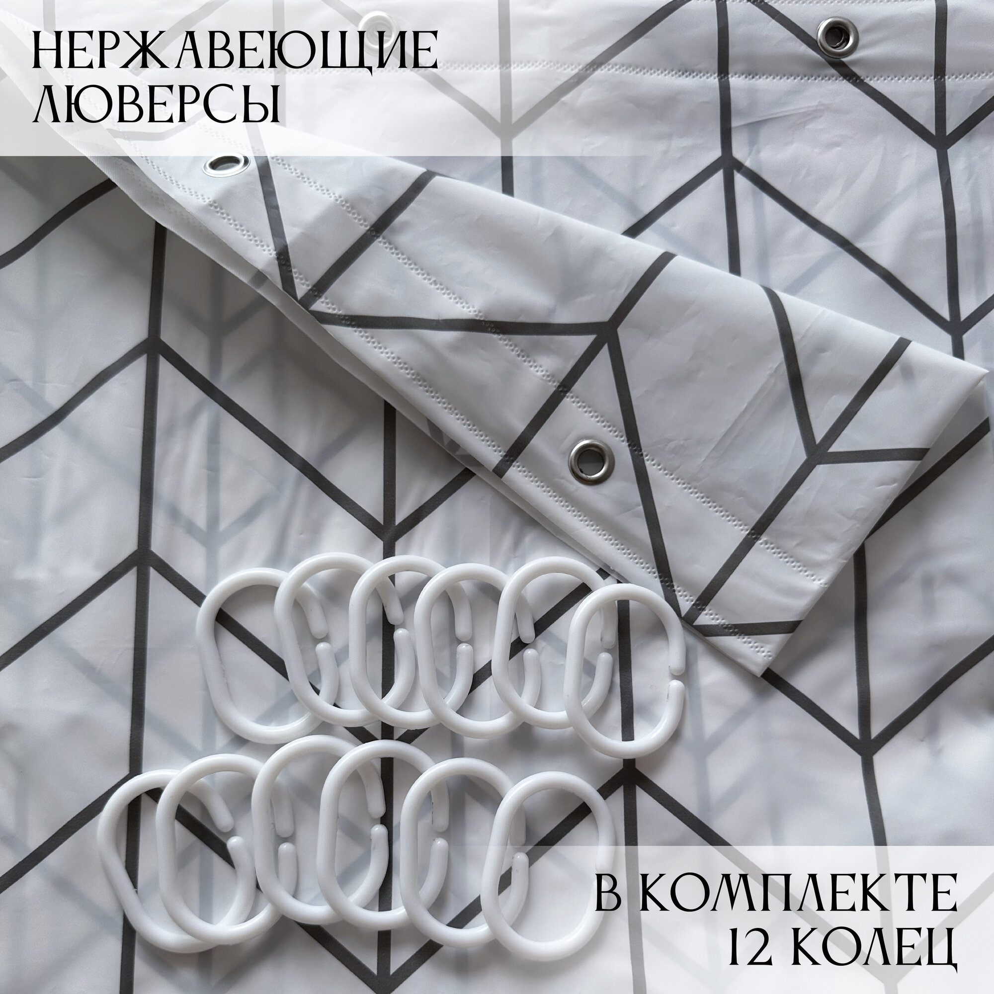 Штора для ванной, белая матовая занавеска душевая водонепроницаемая 180х180 с люверсами и кольцами Rocco Home интересное: