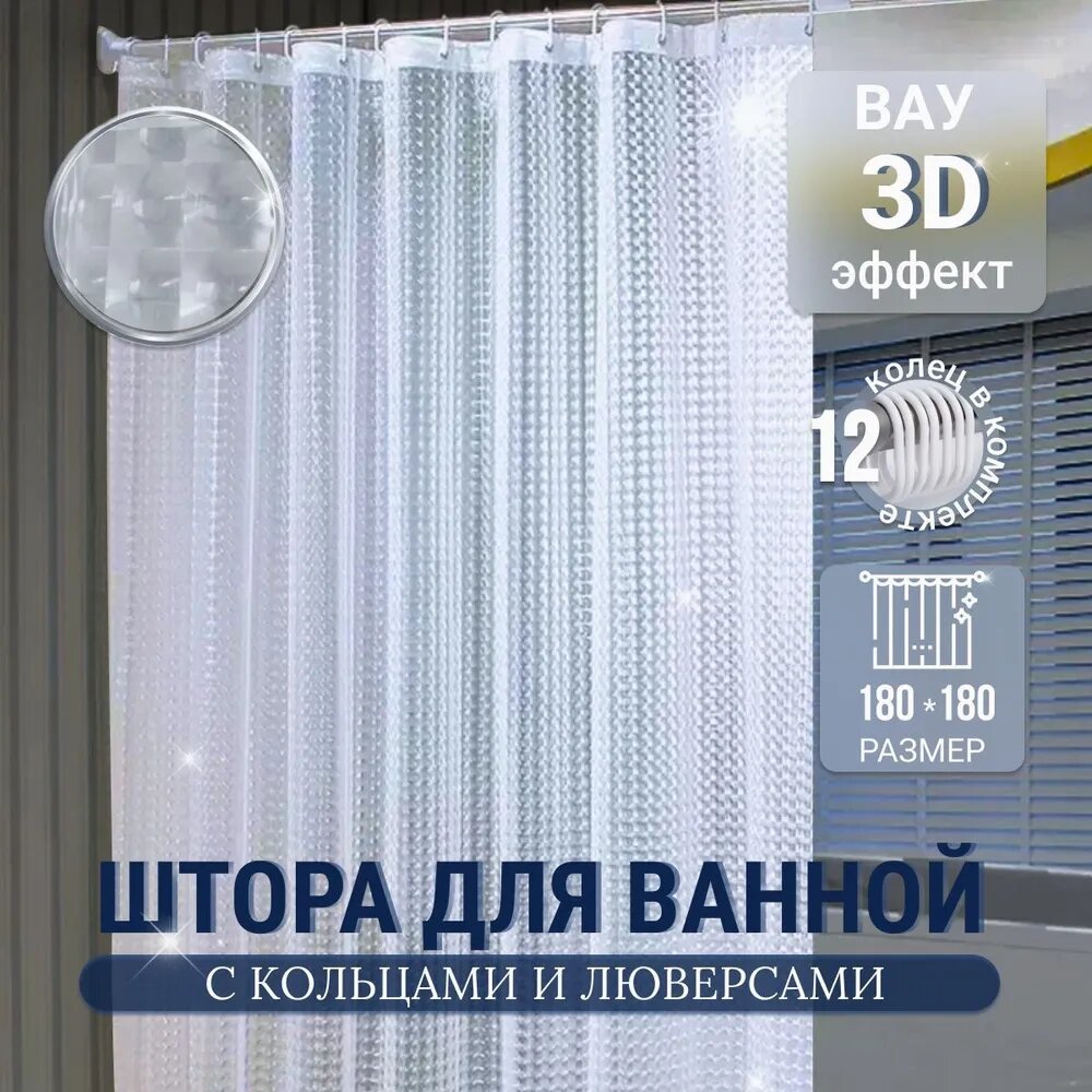 Штора для ванной комнаты с кольцами и люверсами, 3D эффект/PEVA материал/ для душа/ Из водоотталкивающего полиэстера/Полупрозрачный цвет/ 180х180 см интересное: