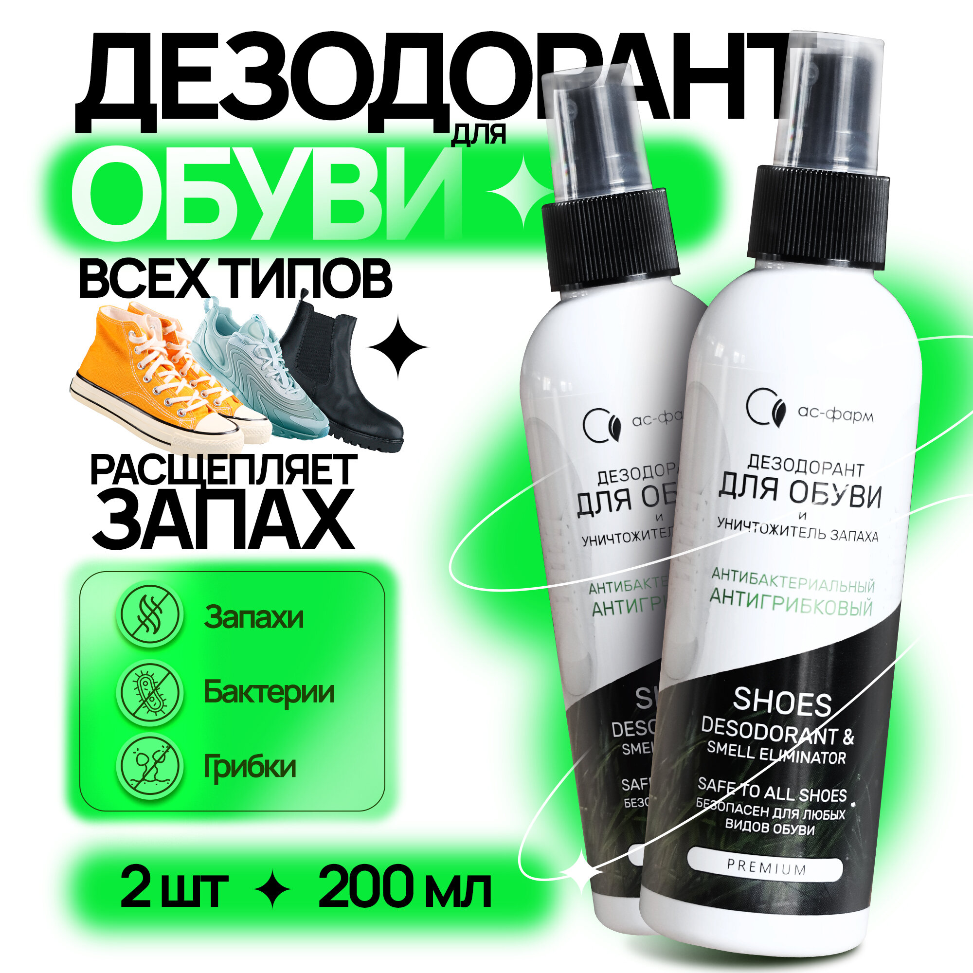 Набор для обуви АС-Фарм, дезодорант для обуви антибактериальный, 200 мл, 2 шт интересное: