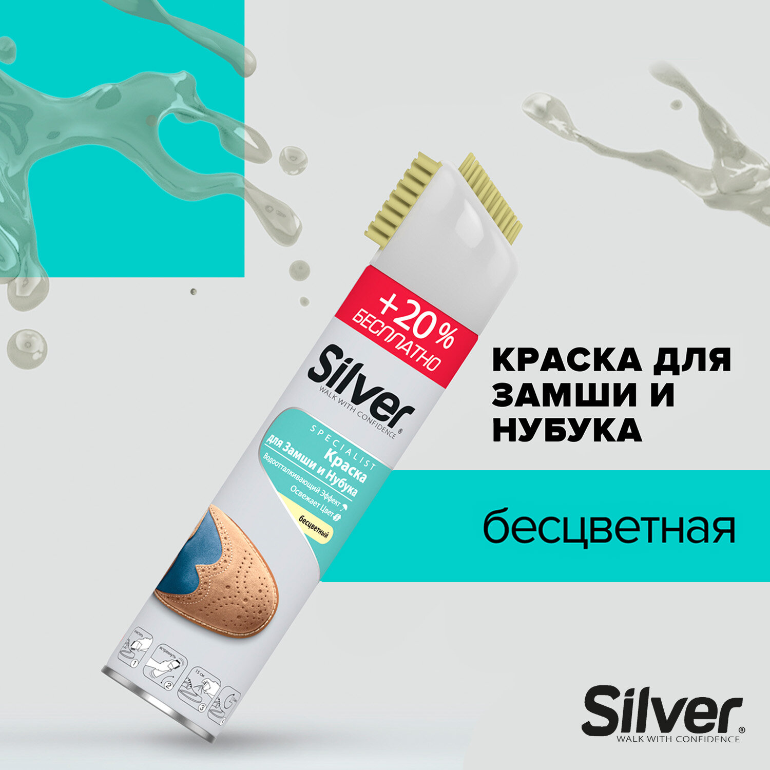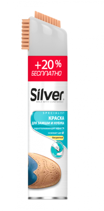 Спрей краска SILVER для нубука и замши 3в1, с щеткой, бесцветная 250 мл .+20% бесплатно