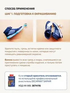 | Дополнительная информация | Стойкий краситель для всех видов натуральных и синтетических гладких кож. Глубоко проникает в структуру кожи, качественно окрашивает и перекрашивает любой цвет в более темный. Эффективно устраняет потертости и царапины, обновляя верхний слой кожи. Отличается высокой стойкостью, не растрескивается. Придает водоотталкивающий эффект. При высыхания образует блеск, дополнительная полировка не требуется. |