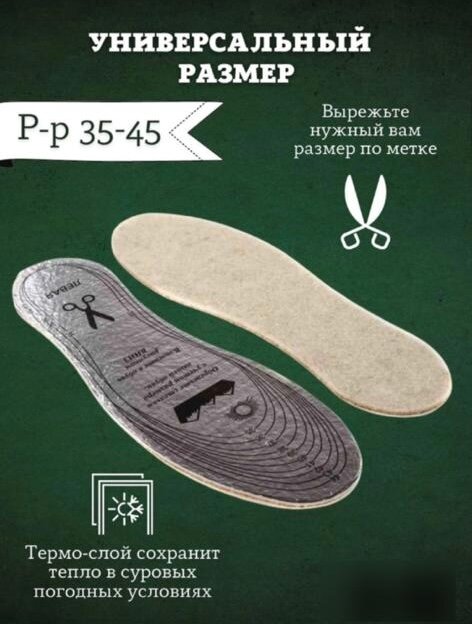 Ниже Вы можете прочитать отзывы на Стельки для обуви зимние "Командирские" Натуральный белый войлок, пробка, металлизированный лавсан, универсальный размер 35-45, ознакомится с подробными характеристиками, посмотреть интересные обзоры и фотографии на Стельки для обуви зимние "Командирские" Натуральный белый войлок, пробка, металлизированный лавсан, универсальный размер 35-45.