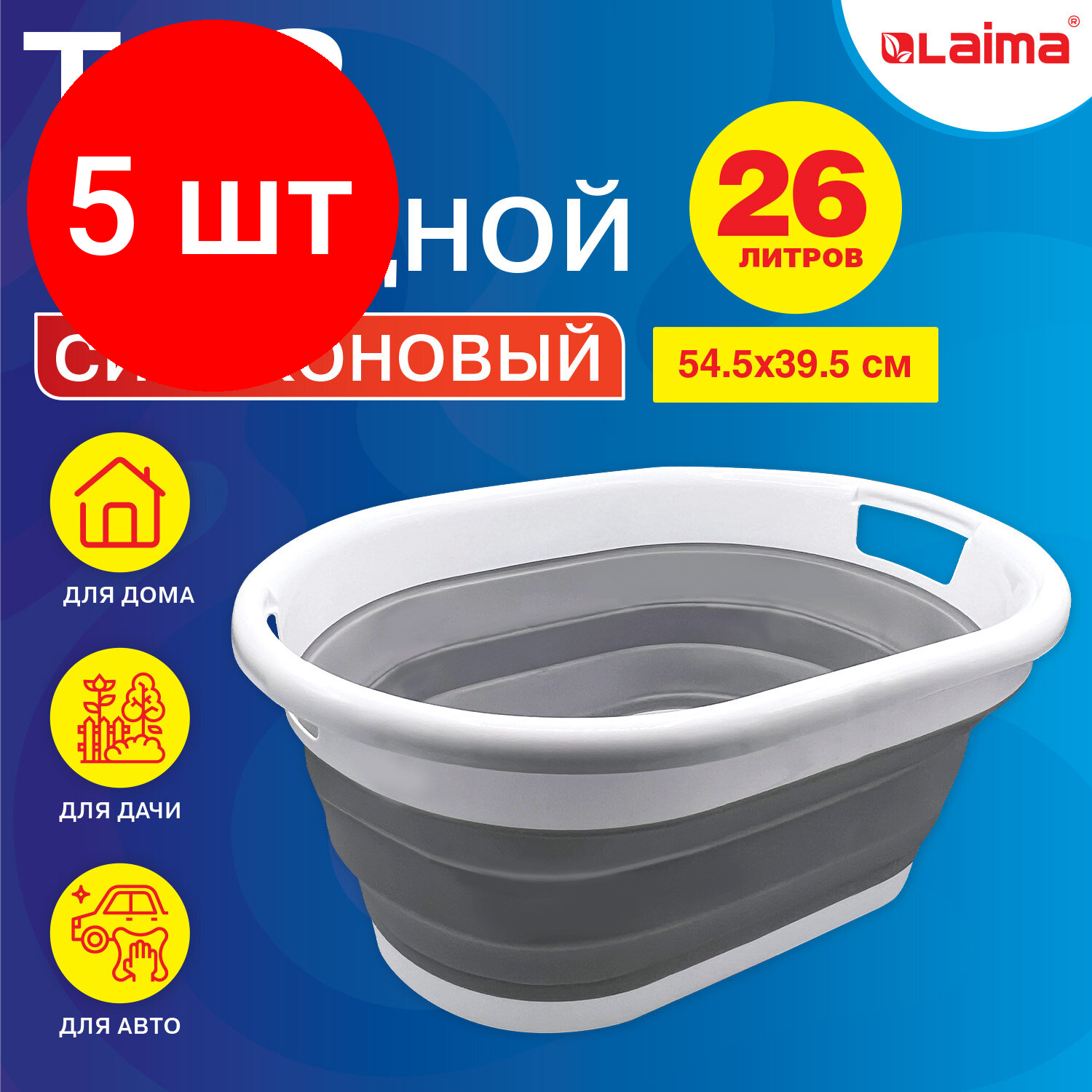 Купить Комплект 5 шт, Таз складной силиконовый 26 литров 54.5х39.5 см для дома и дачи, LAIMA Home, 608670