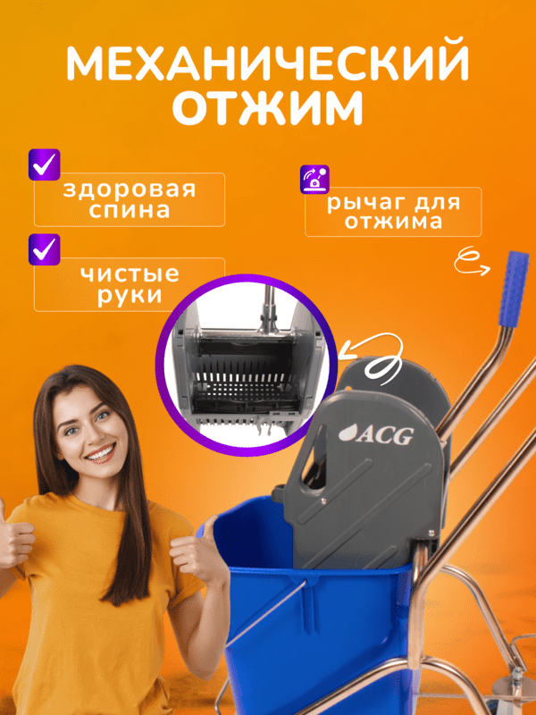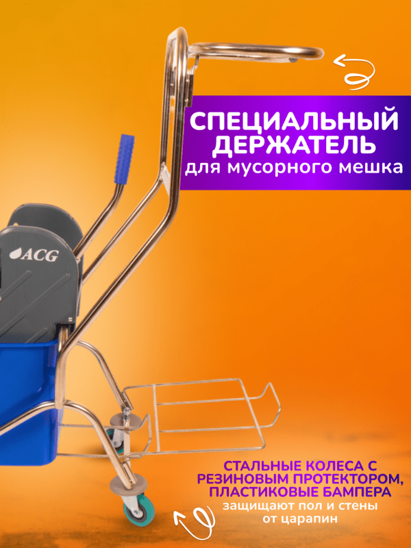 Тележка уборочная ACG 25 л. с отжимом, с держателем мешка для мусора и поддоном, каркас из нержавейки интересное: