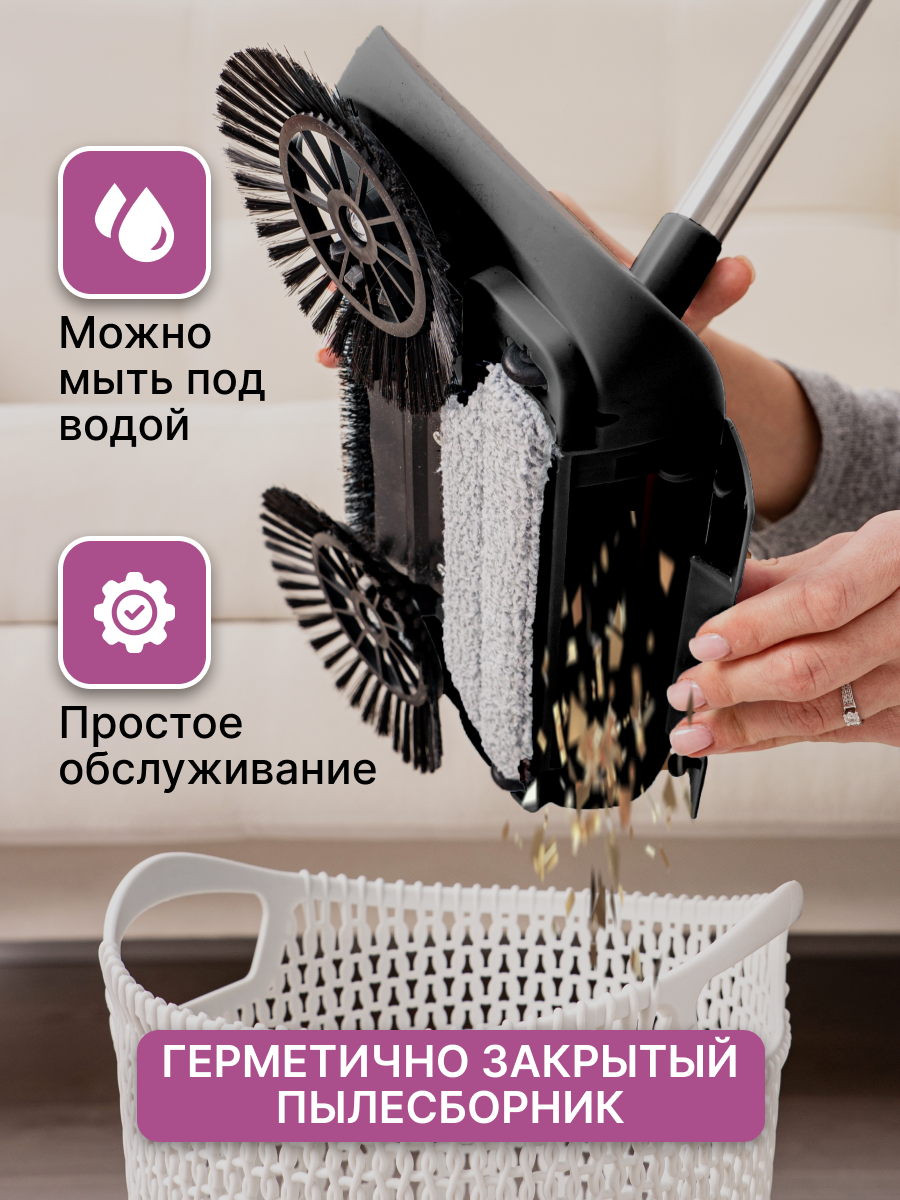 | Дополнительная информация | Наличие дополнительной микрофибры на основании контейнера для сбора пыли, шерсти и мелких волосков. Подходит для быстрой влажной уборки гладких покрытий |