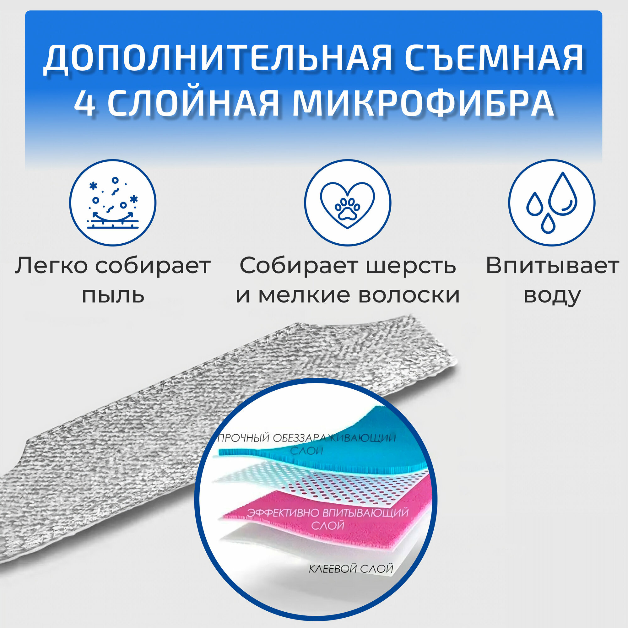 | Дополнительная информация | Наличие дополнительной микрофибры на основании контейнера для сбора пыли, шерсти и мелких волосков. Подходит для быстрой влажной уборки гладких покрытий |