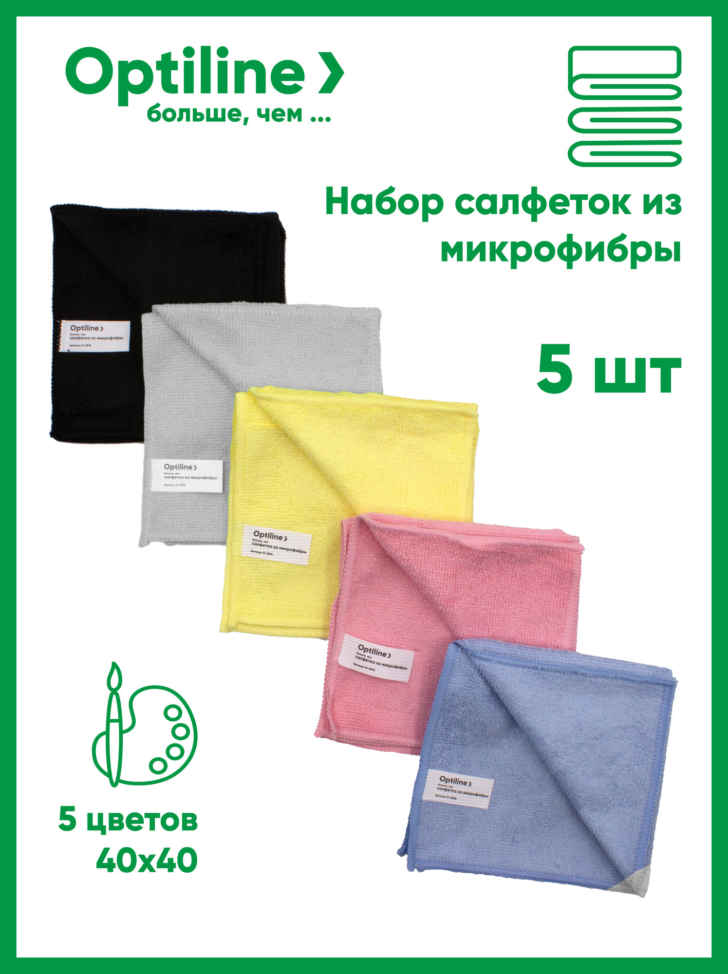 Купить Салфетки для уборки из микрофибры 5 шт, 220 гр, 40*40 см, 5 цветов, Optiline