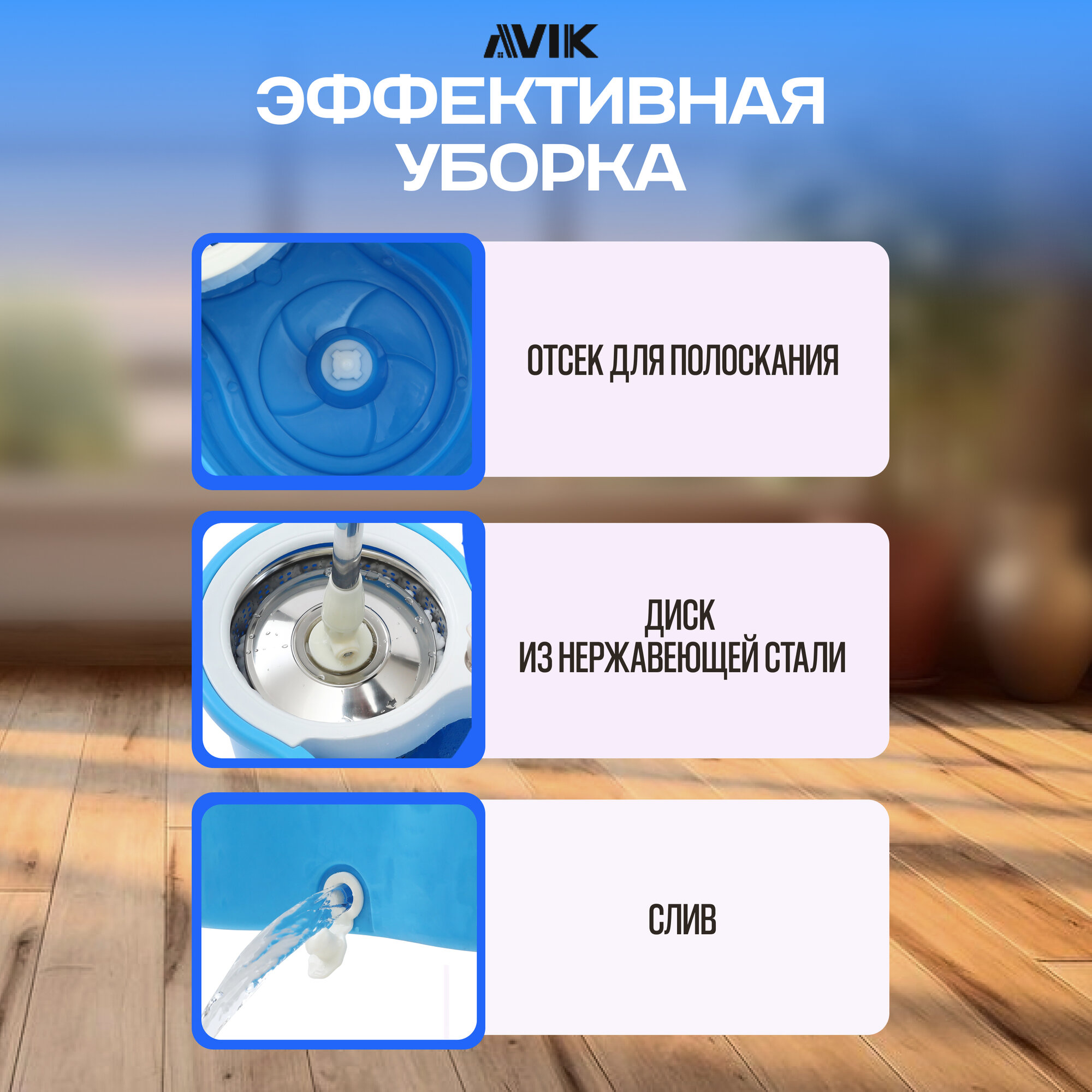 Ниже Вы можете прочитать отзывы на Комплект для уборки AVIK / Швабра с отжимом и ведром (145 см ручка + 3 насадки + дозатор для моющего средства), ознакомится с подробными характеристиками, посмотреть интересные обзоры и фотографии на Комплект для уборки AVIK / Швабра с отжимом и ведром (145 см ручка + 3 насадки + дозатор для моющего средства).
