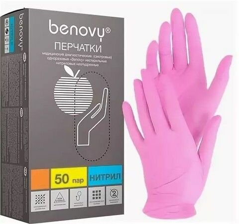Перчатки Benovy нитриловые смотровые, 100 шт, S, розовый