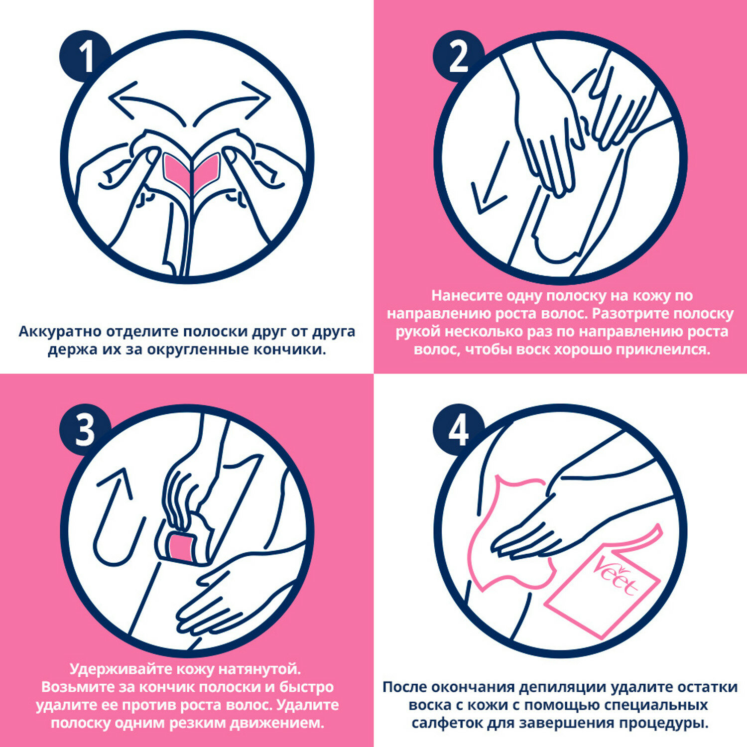 | Способ применения | 1. Аккуратно отделите полоски друг от друга держа их за закругленные кончики. 2. Нанесите одну полоску на кожу по направлению роста волос. Разотрите полоску рукой несколько раз по направлению роста волос, чтобы воск хорошо приклеился. 3. Удерживайте кожу натянутой. Возьмите за кончик полоски и быстро удалите ее против роста волос. Удалите полоску одним резким движением близко к коже. 4. После окончания депиляции удалите остатки воска с кожи с помощью специальных салфеток для завершения процедуры |