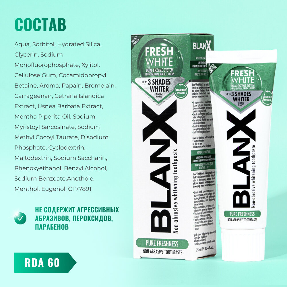 | Состав | Aqua, Sorbitol, Hydrated Silica, Glycerin, Sodium Monofluorophosphate, Xylitol, Cellulose Gum, Cocamidopropyl Betaine, Aroma, Papain, Bromelain, Carrageenan, Cetraria Islandica Extract, Usnea Barbata Extract, Mentha Piperita Oil, Sodium Myristoyl Sarcosinate, Sodium Methyl Cocoyl Taurate, Disodium Phosphate, Cyclodextrin, Maltodextrin, Sodium Saccharin, Phenoxyethanol, Benzyl Alcohol, Sodium Benzoate, Anethole, Menthol, Eugenol, CI 77891. |