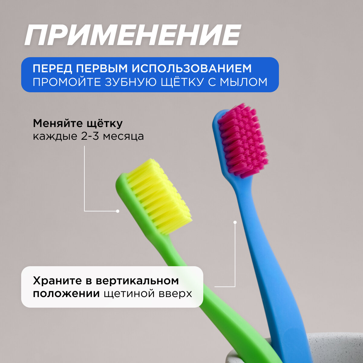 | Дополнительная информация | перед применением новую зубную щётку промыть в тёплой воде с мылом, хранить щётку в вертикальном положении щетиной вверх, рекомендуемый срок использования: 2–3 месяца |