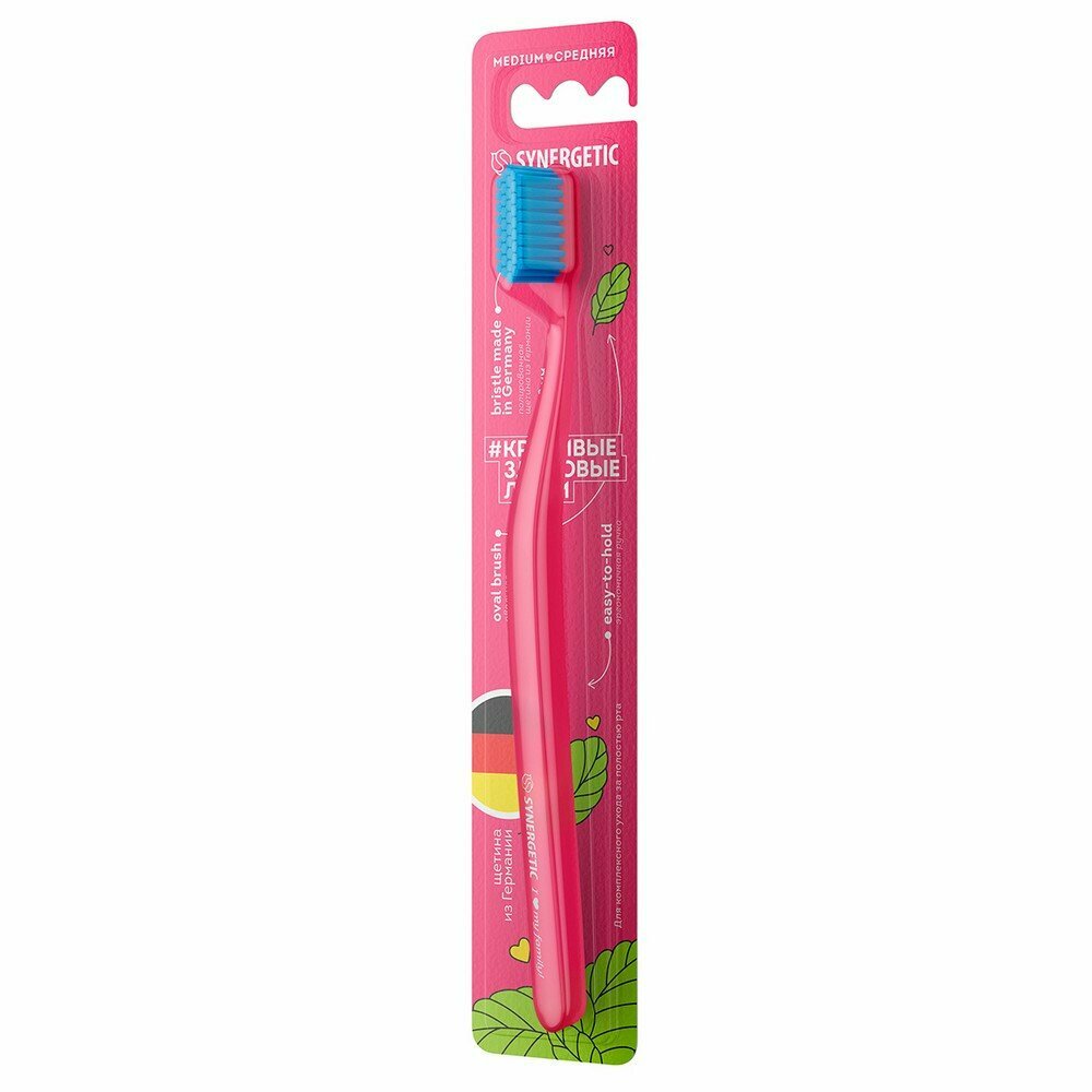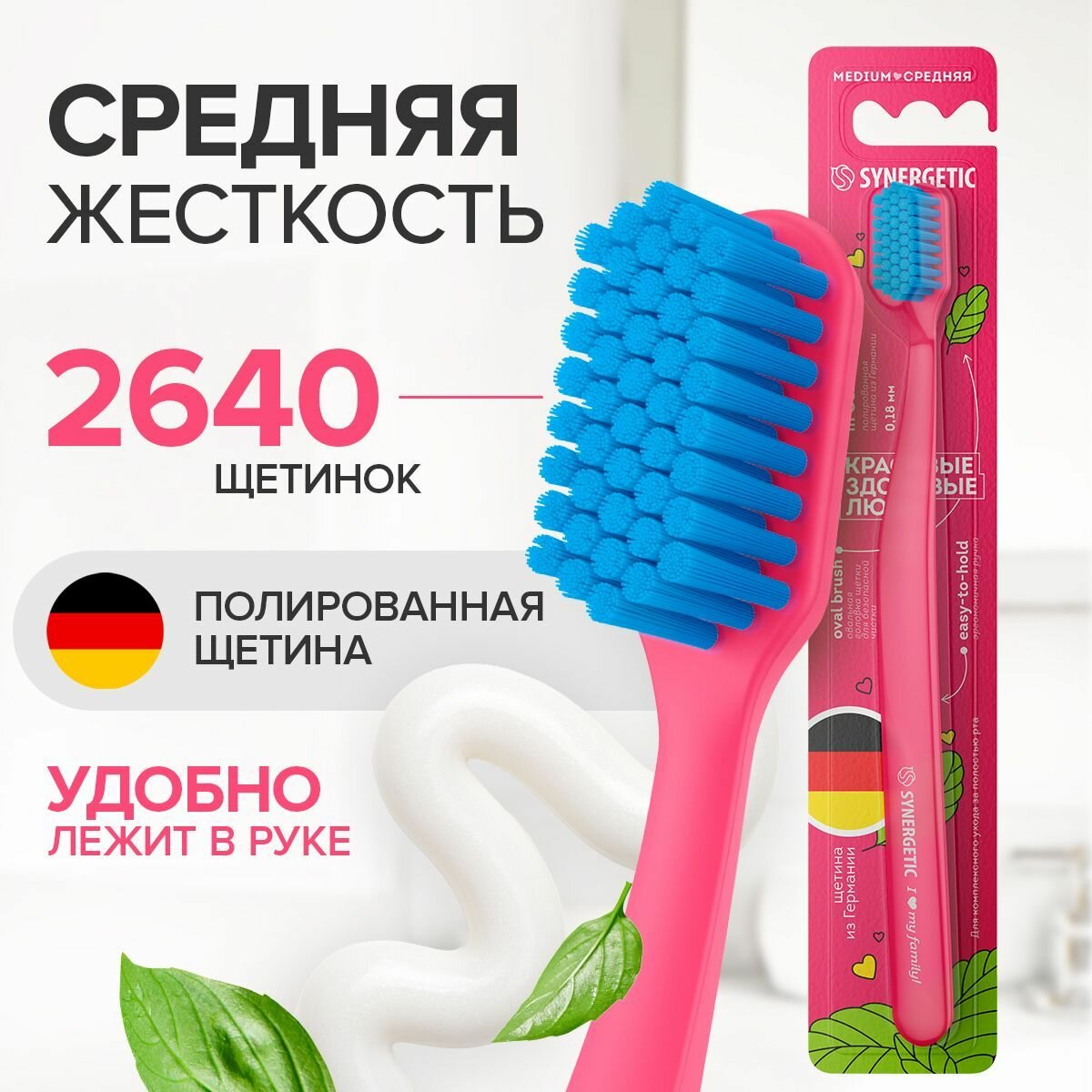Зубная щетка для взрослых Synergetic средней жёсткости + детская зубная щетка от 3 до 6 лет мягкая розовая