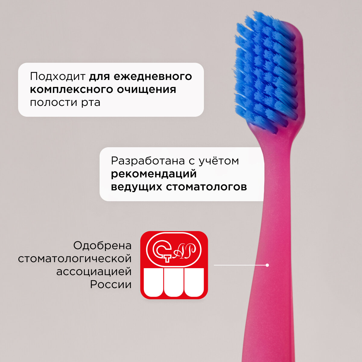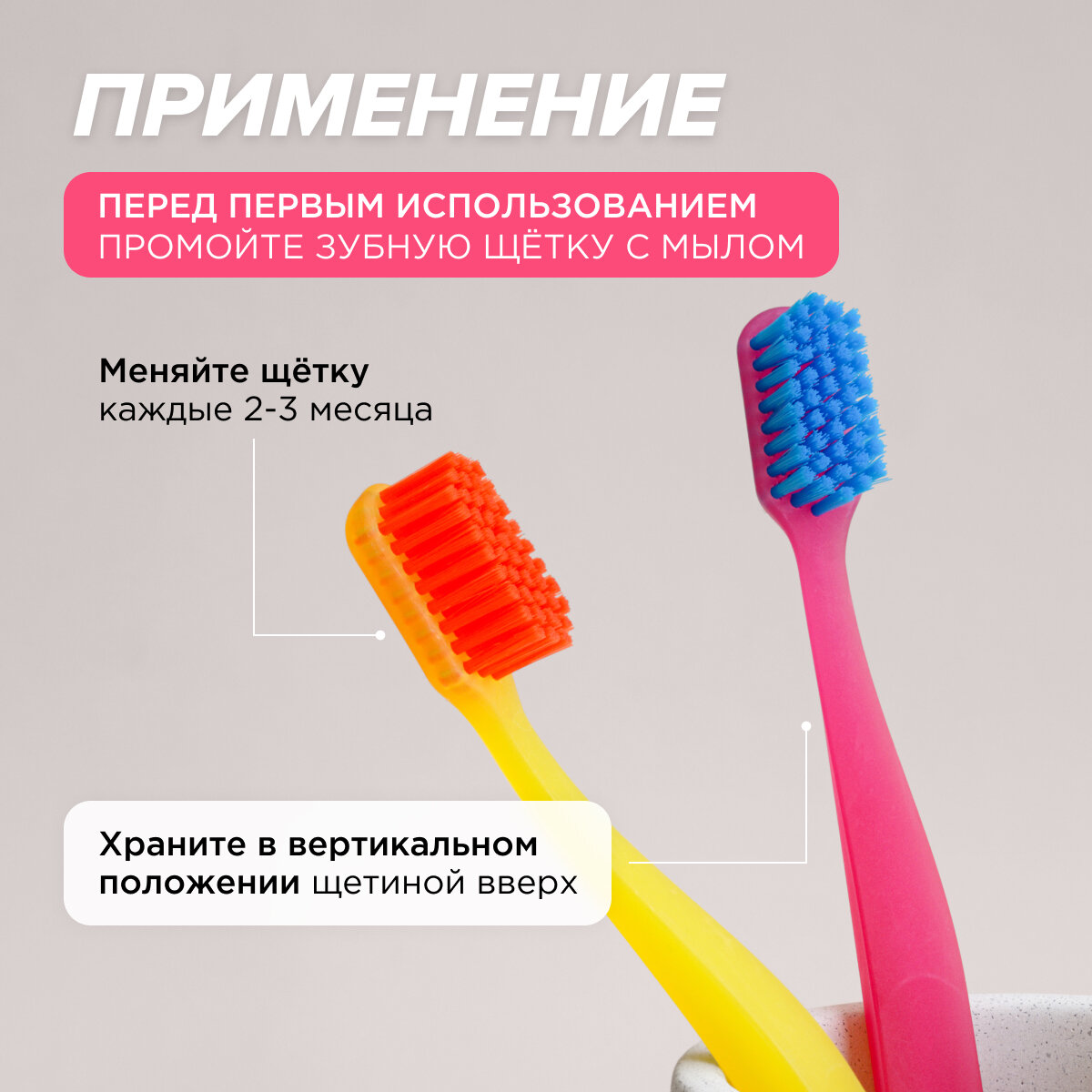 | Дополнительная информация | перед применением новую зубную щётку промыть в тёплой воде с мылом, хранить щётку в вертикальном положении щетиной вверх, рекомендуемый срок использования: 2–3 месяца |