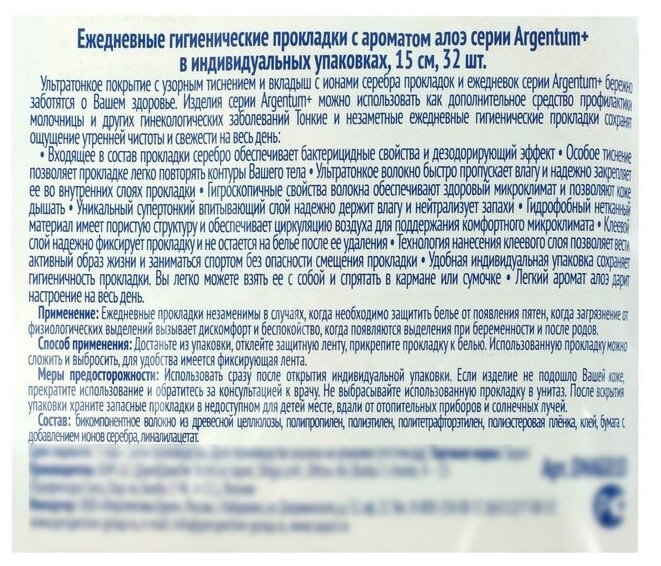 Купить Прокладки ежедневные Sayuri с аром. алоэ Argentum+, 15 см, 32 шт