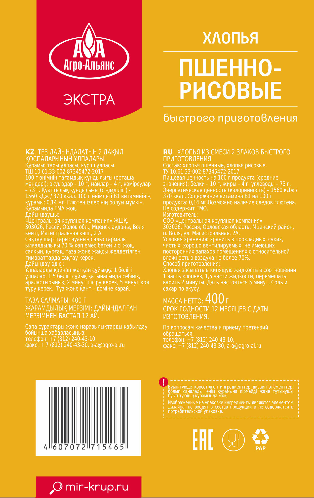 Купить Хлопья пшенно-рисовые "Агро-Альянс Экстра", 400 г