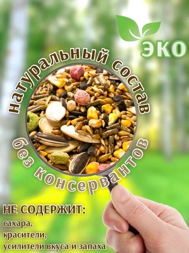 | Состав | Овес, пшеница, ячмень, яблоки, груша, абрикос, морковь, тыква, кабачок, горох, кукуруза, семечки подсолнечника, семечки тыквенные, гранулят, люцерна, пивные дрожжи, пшеничные отруби, луговые травы, пробиотик, адсорбент, антиоксидант, натуральные компоненты растительного и животного происхождения, минеральные вещества и витамины. |