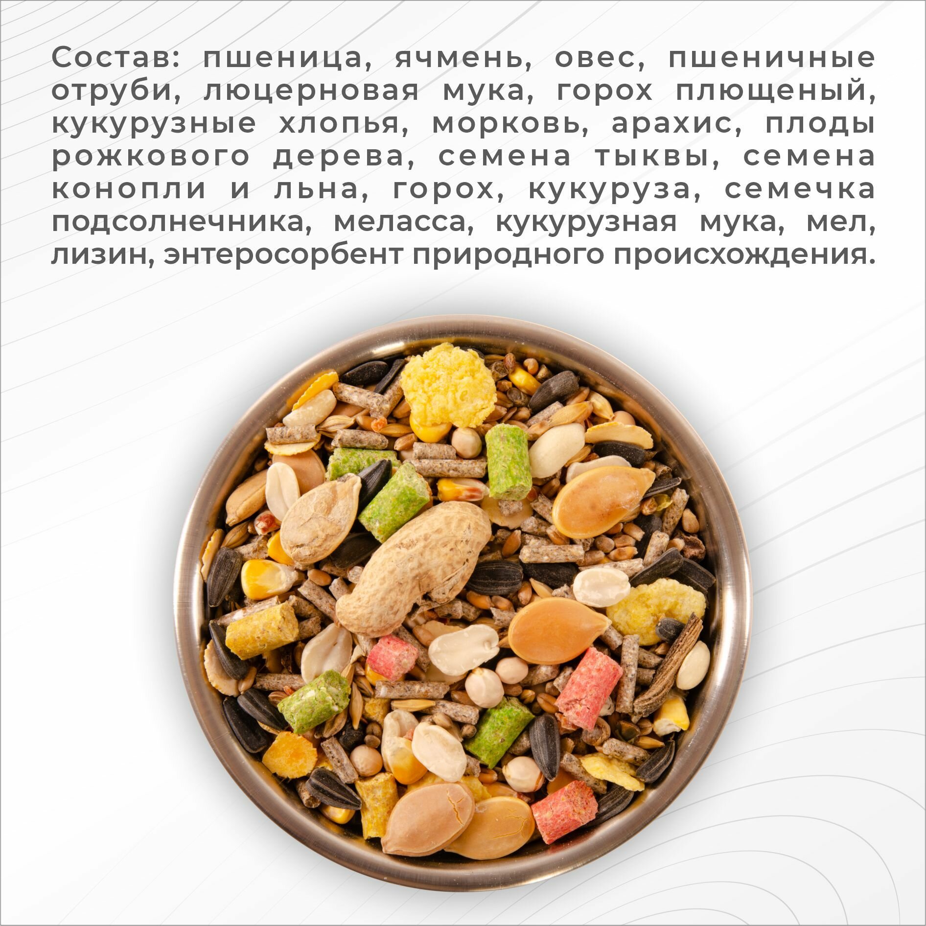 | Состав | пшеница, ячмень, овес, пшеничные отруби, люцерновая мука, горох плющеный, кукурузные хлопья, морковь, арахис, плоды рожкового дерева, семена тыквы, семена конопли и льна, горох, кукуруза, семечка подсолнечника, меласса, кукурузная мука, мел, лизин, энтеросорбент природного происхождения. |