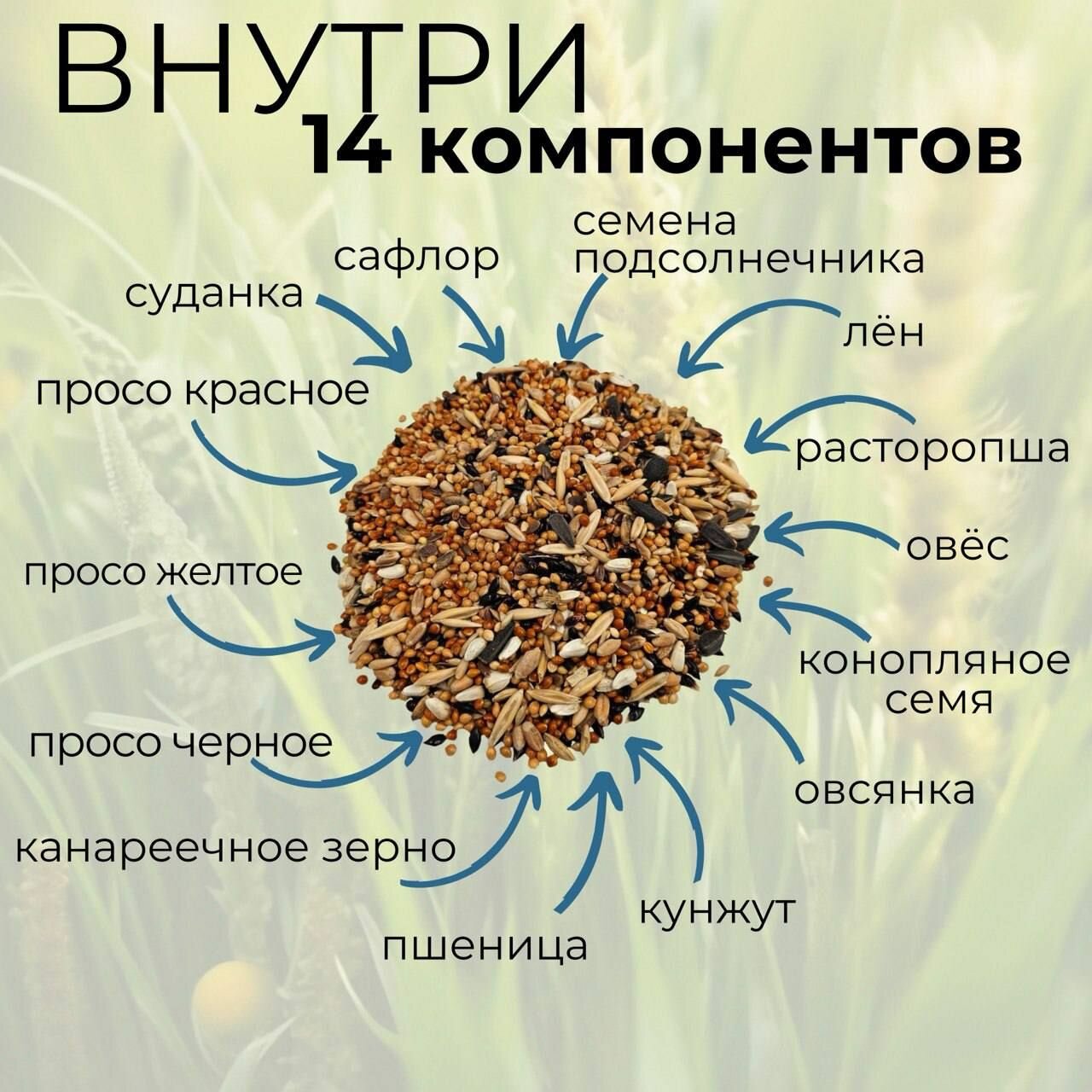 | Дополнительная информация | просо красное, просо желтое, просо черное, овес, пшеница, семена подсолнечника, ячмень, овсянка, суданка |