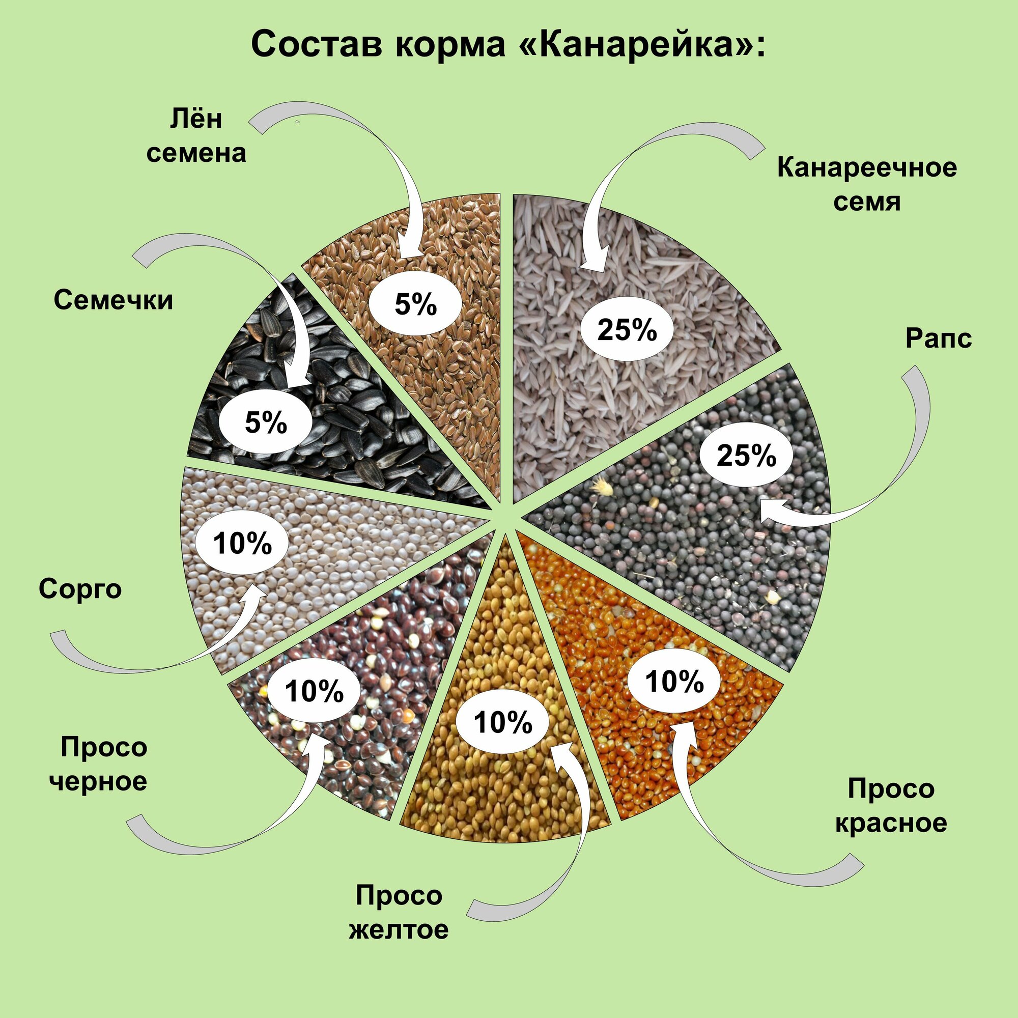 | Состав | канареечное семя, рапс, красное просо, желтое просо, черное просо, сорго белое, семена льна, семена подсолнечника |
