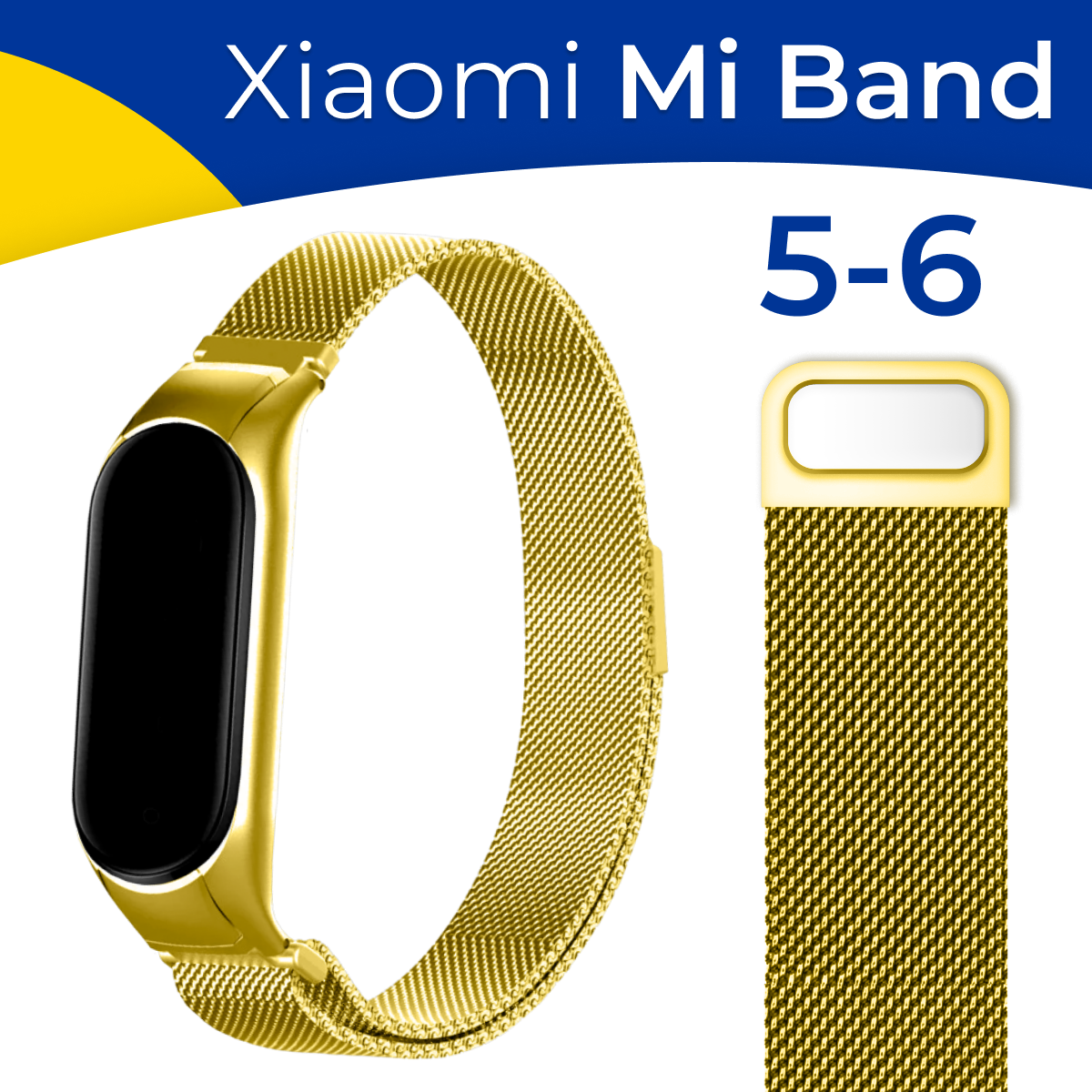 Металлический ремешок для фитнес-трекера Xiaomi Mi Band 5 и 6 / Стальной браслет миланская петля для умных смарт часов Сяоми Ми Бэнд 5 и 6 / Золотой