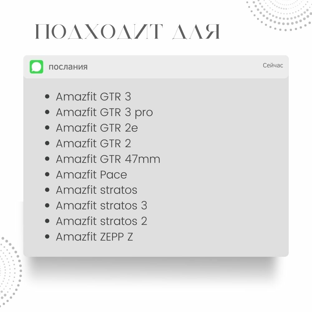| Совместимые модели умных часов | Amazfit GTR 2, Amazfit GTR 2e, Amazfit GTR 3 Pro, Amazfit GTR 47 мм, Amazfit Pace, Amazfit Stratos, Amazfit Stratos 2, Amazfit Stratos 3 |