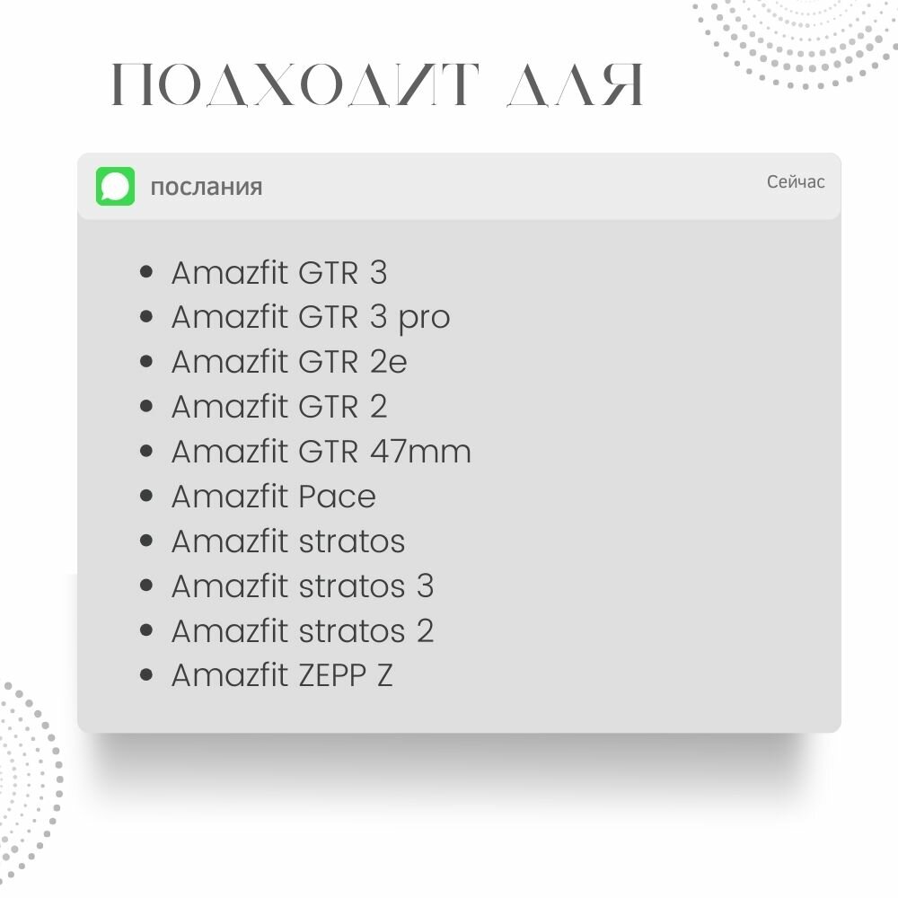 | Совместимые модели умных часов | Amazfit GTR 2, Amazfit GTR 2e, Amazfit GTR 3 Pro, Amazfit GTR 47 мм, Amazfit Pace, Amazfit Stratos, Amazfit Stratos 2, Amazfit Stratos 3 |