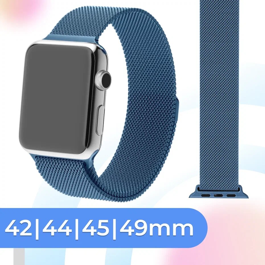 Металлический ремешок для умных часов Apple Watch 42-44-45-49 mm / Сменный браслет миланская петля для часов Эпл Вотч 1-9, SE, Ultra серии / Синий