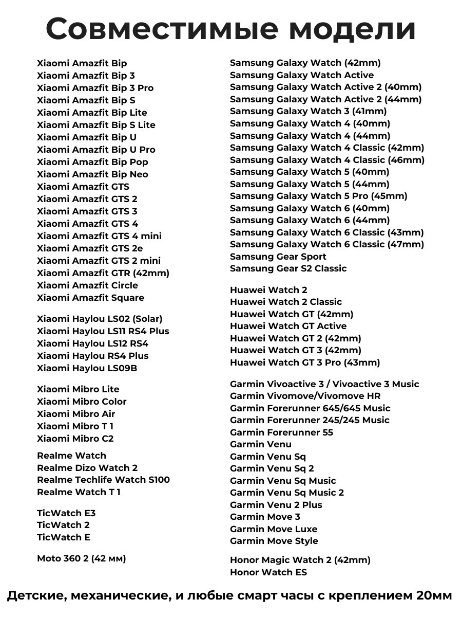 | Совместимые модели умных часов | Amazfit Bip, Amazfit Bip 3, Amazfit Bip U Pro, Amazfit GTS 2, Amazfit GTS 4 mini, универсальный |