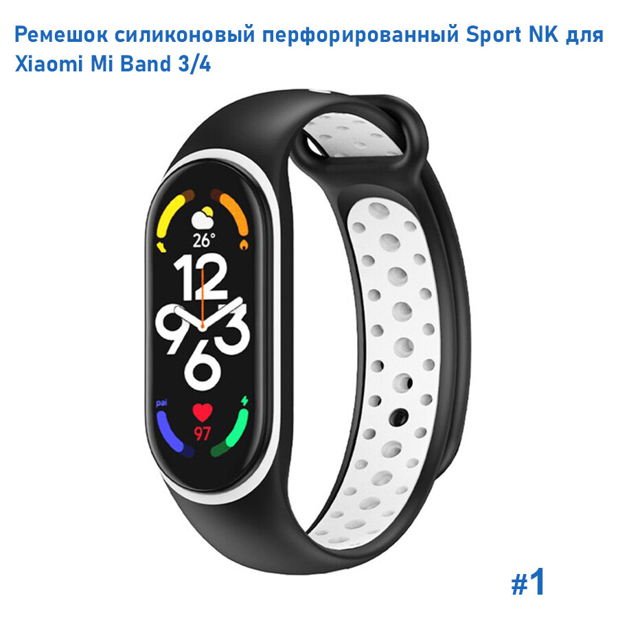 Купить Ремешок силиконовый перфорированный Sport NK для Xiaomi Mi Band 3/4, на кнопке, черный+белый (1)